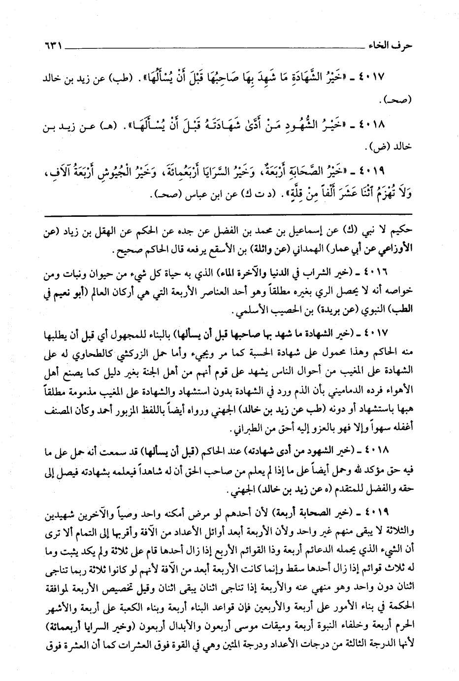 4018 (خير الشهود من أدى شهادته) عند الحاكم (قبل أن يسألها) قد سمعت أنه حمل على ما فيه حق مؤكد لله وحمل أيضا على ما إذا لم يعلم من صاحب الحق أن له شاهدا فيعلمه بشهادته فيصل إلى حقه والفضل للمتقدم (ه عن زيد بن خالد) الجهني.