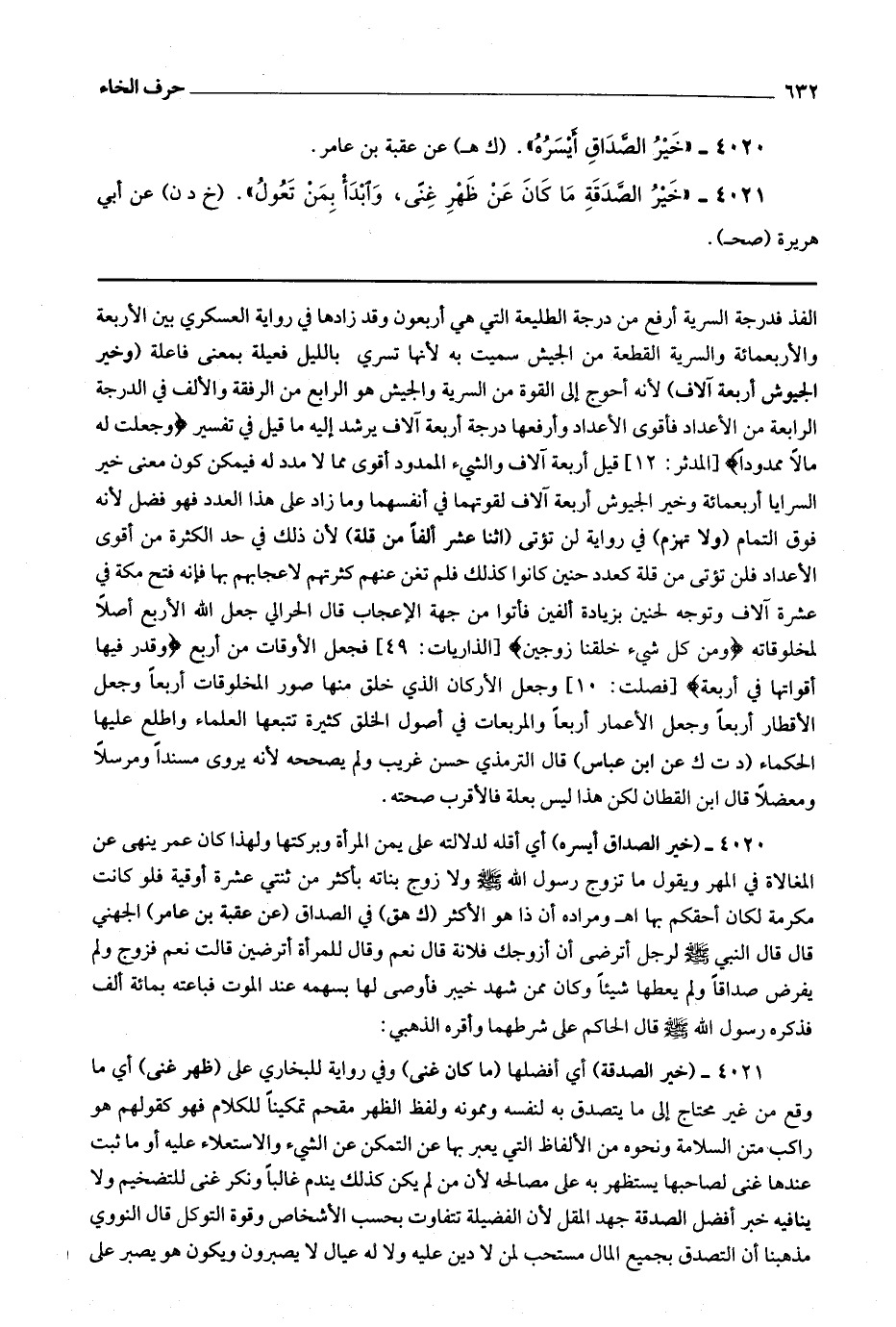 4021 (خير الصدقة) أي أفضلها (ما كان عن ظهر غنى) وفي رواية للبخاري (على ظهر غنى) أي ما وقع من غير محتاج إلى ما يتصدق به لنفسه وممونه ولفظ الظهر مقحم تمكينا للكلام فهو كقولهم هو راكب متن السلامة ونحوه من الألفاظ التي يعبر بها عن التمكن عن الشئ والاستعلاء عليه أو ما ثبت عندها غنى لصاحبها يستظهر به على مصالحه لأن من لم يكن كذلك يندم غالبا ونكر غنى للتفخيم ولا ينافيه خبر أفضل الصدقة جهد المقل لأن الفضيلة تتفاوت بحسب الأشخاص وقوة التوكل.