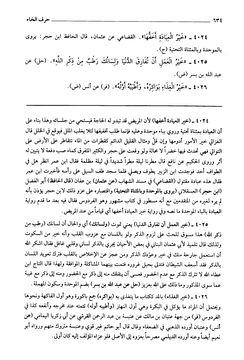 ابن حجر العسقلاني : يروى بالموحدة وبالمثناة التحتية واقتصاره على عزو ذلك لابن حجر يؤذن بأنه لم يره لغيره من المتقدمين مع أنه مسطور في كتاب مشهور وهو الفردوس فقال فيه بعد ما قدم رواية العبادة بالباء الموحدة ما نصه : وفي رواية خير العبادة أخفها أي قياما من عند المريض.