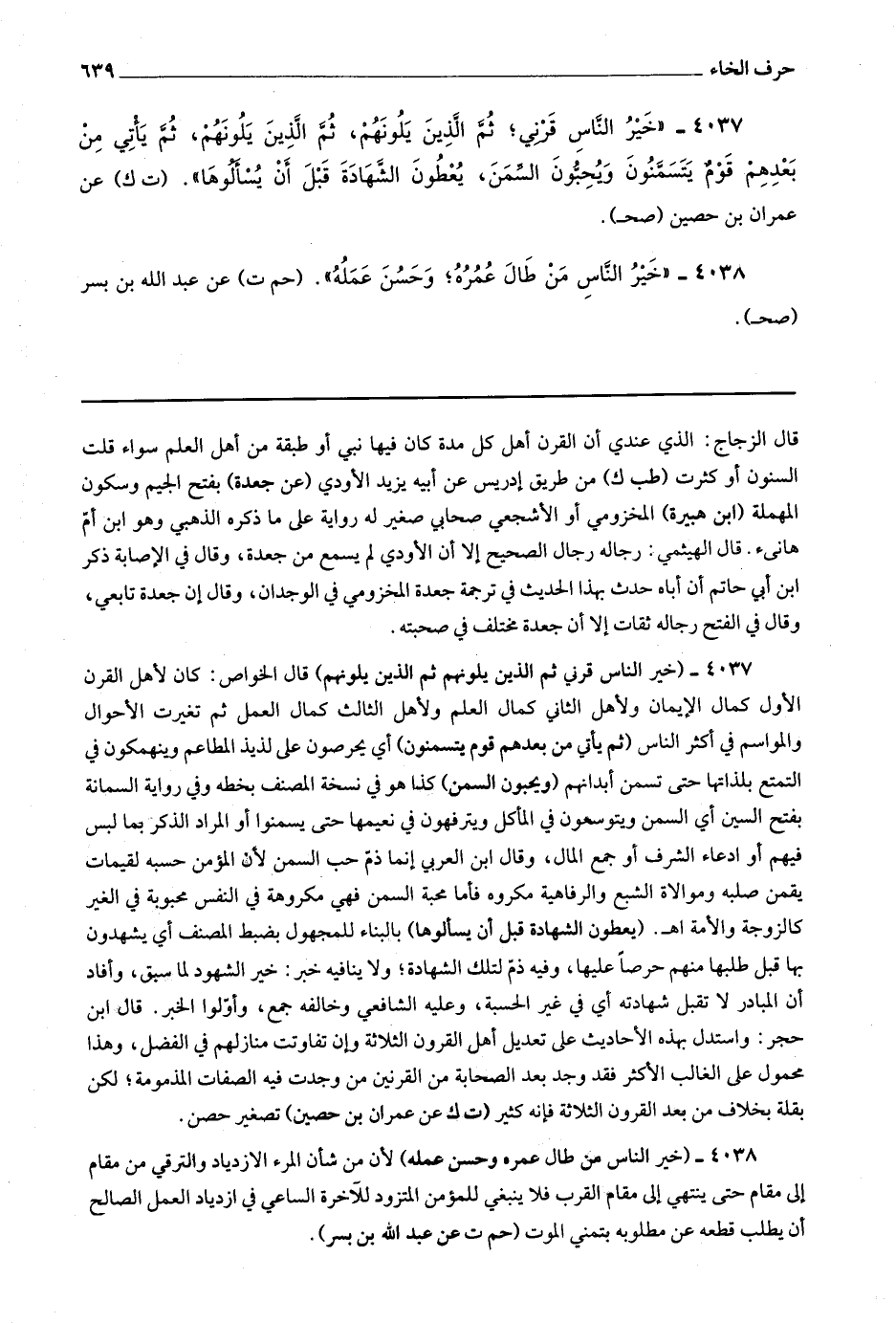 قال ابن حجر : واستدل بهذه الأحاديث على تعديل أهل القرون الثلاثة وإن تفاوتت منازلهم في الفضل ، وهذا محمول على الغالب الأكثر فقد وجد بعد الصحابة من القرنين من وجدت فيه الصفات المذمومة ، لكن بقلة بخلاف من بعد القرون الثلاثة فإنه كثير (ت ك عن عمران ابن حصين) تصغير حصن.