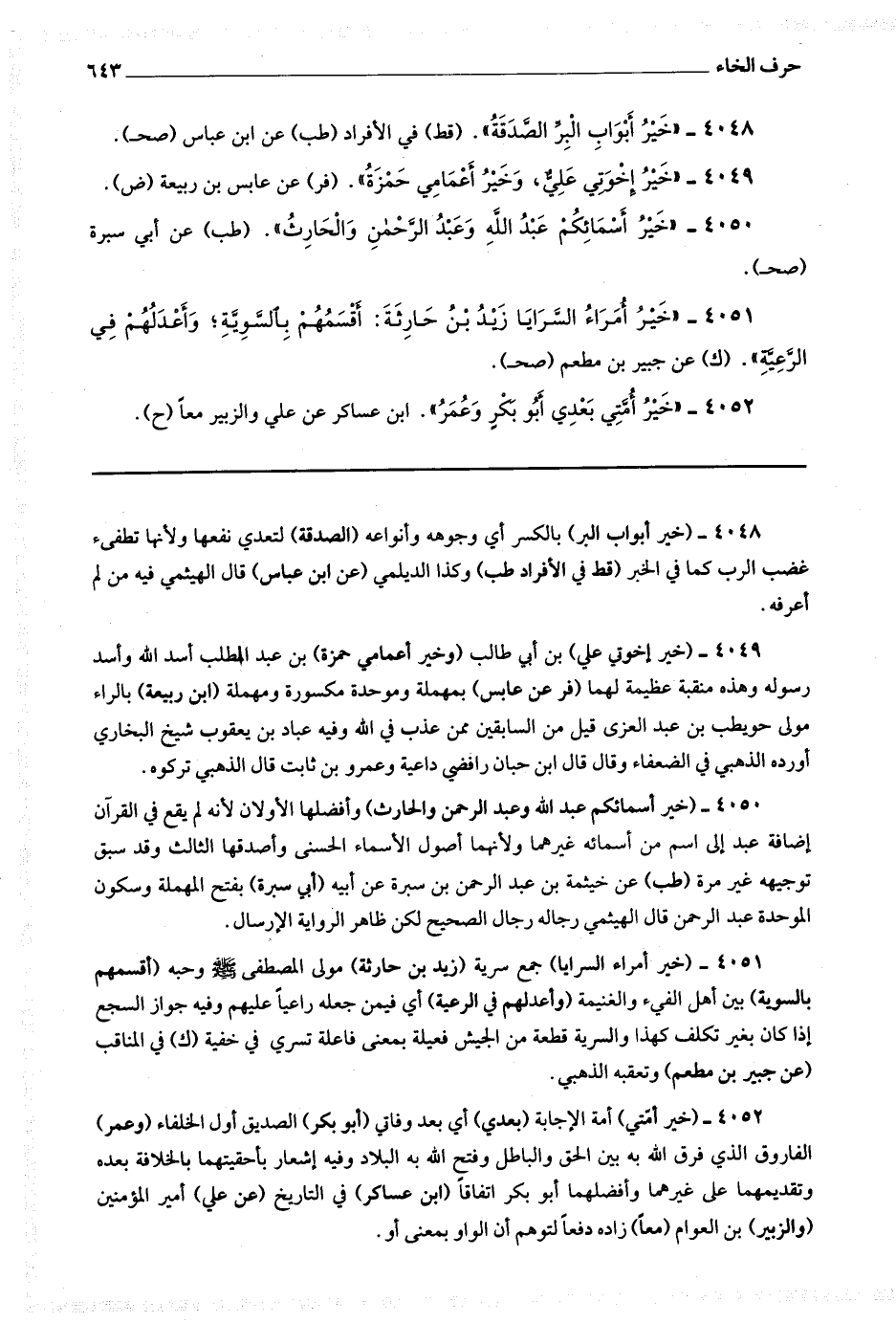 4050 (خير أسمائكم عبد الله وعبد الرحمن والحارث) وأفضلها الأولان لأنه لم يقع في القرآن إضافة عبد إلى اسم من أسمائه غيرهما ولأنهما أصول الأسماء الحسنى وأصدقها الثالث وقد سبق توجيهه غير مرة.