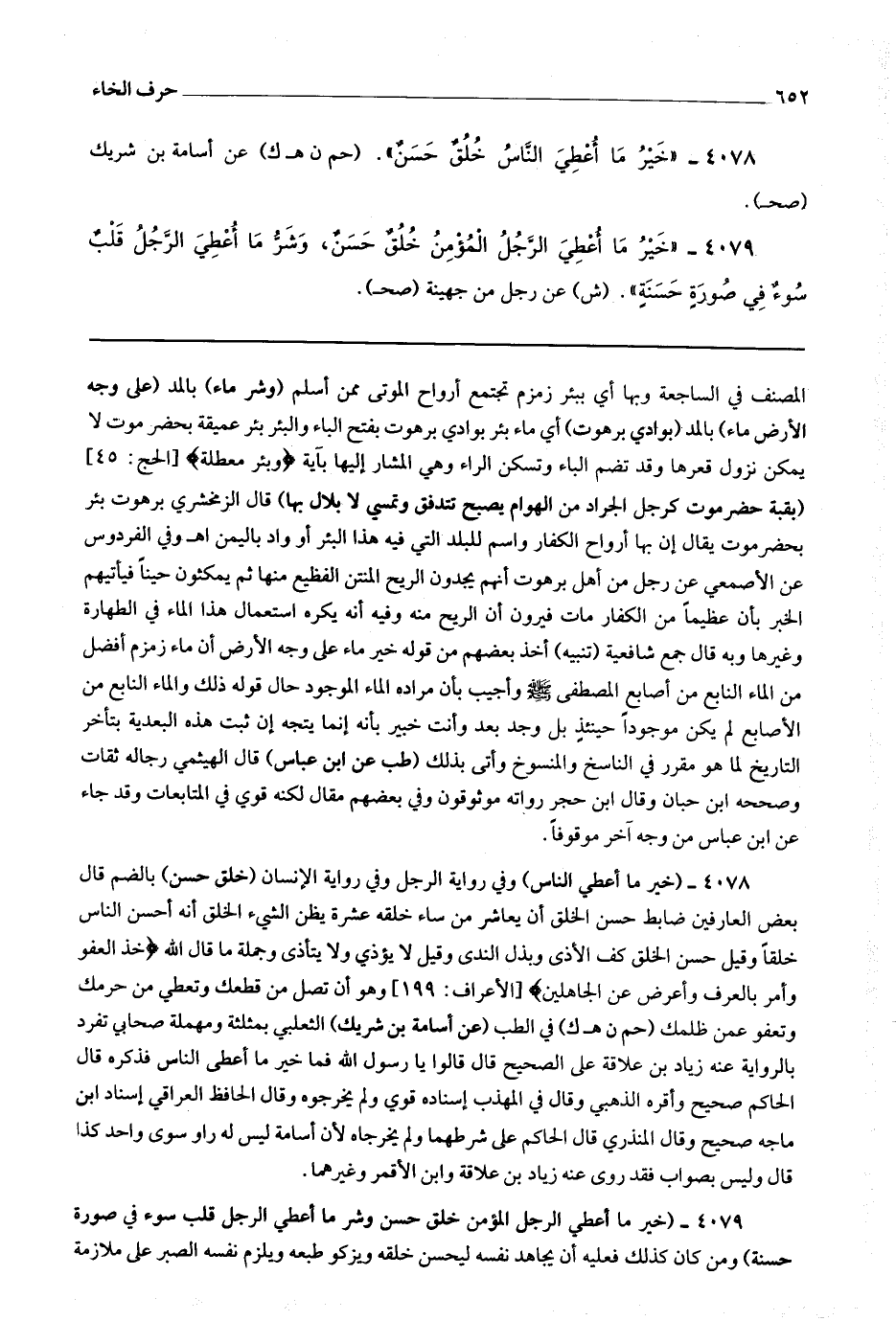 4078 (خير ما أعطي الناس) وفي رواية الرجل وفي رواية الإنسان (خلق حسن) بالضم قال بعض العارفين : ضابط حسن الخلق أن يعاشر من ساء خلقه عشرة يظن الشئ الخلق أنه أحسن الناس خلقا وقيل حسن الخلق كف الأذى وبذل الندى وقيل لا يؤذى ولا يتأذى وجملة ما قال الله * (خذ العفو وأمر بالعرف وأعرض الجاهلين) * وهو أن تصل من قطعك وتعطي من حرمك وتعفو عمن ظلمك (حم ن ه ك) في الطب (عن أسامة بن شريك) الثعلبي بمثلثة ومهملة صحابي تفرد بالرواية عنه زياد بن علاقة على الصحيح قال : قالوا : يا رسول الله فما خير ما أعطي الناس فذكره قال الحاكم : صحيح وأقره الذهبي وقال في المهذب : إسناده قوي ولم يخرجوه وقال الحافظ العراقي : إسناد ابن ماجه صحيح وقال المنذري : قال الحاكم على شرطهما ولم يخرجاه لأن أسامة ليس له راو سوى واحد كذا قال وليس بصواب فقد روى عنه زياد بن علاقة وابن الأقمر وغيرهما.