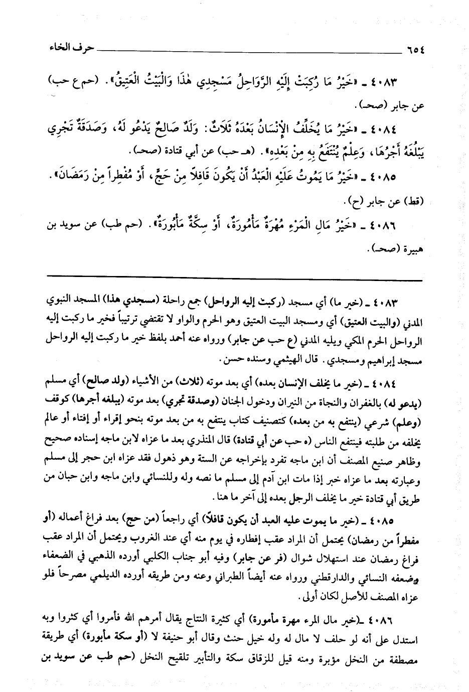 4085 (خير ما يموت عليه العبد أن يكون قافلا) أي راجعا (من حج) بعد فراغ أعماله (أو مفطرا من رمضان) يحتمل أن المراد عقب إفطاره في يوم منه أي عند الغروب ويحتمل أالمراد عقب فراغ رمضان عند استهلال شوال (فر عن جابر) وفيه أبو جناب الكلبي أورده الذهبي في الضعفاء وضعفه النسائي والدارقطني ورواه عنه أيضا الطبراني وعنه ومن طريقه أورده الديلمي مصرحا فلو عزاه المصنف للأصل لكان أولى 4086 (خير مال المرء مهرة مأمورة) أي كثيرة النتاج يقال أمرهم الله فأمروا أي كثروا وبه استدل على أنه لو حلف لا مال له وله خيل حنث وقال أبو حنيفة لا (أو سكة مأبورة) أي طريقة مصطفة من النخل مؤبرة ومنه قيل للزقاق سكة والتأبير تلقيح النخل (حم طب عن سويد بن
