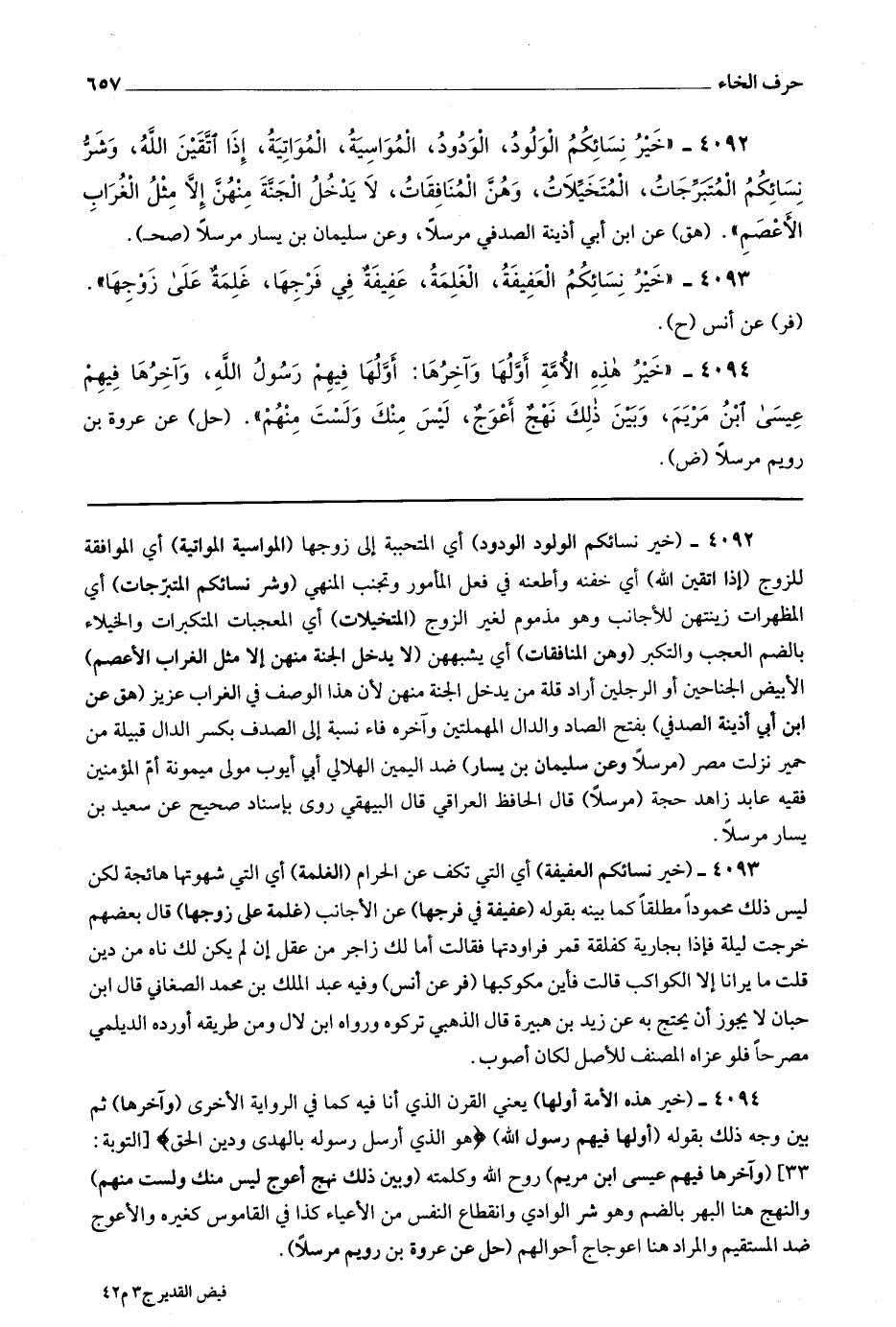 4092 (خير نسائكم الولود الودود) أالمتحببة إلى زوجها (المواسية المواتية) أي الموافقة للزوج (إذا اتقين الله أي خفنه وأطعنه في فعل المأمور وتجنب المنهي (وشر نسائكم المتبرجات) أي المظهرات زينتهن للأجانب وهو مذموم لغير الزوج (المتخيلات) أي المعجبات المتكبرات والخيلاء بالضم العجب والتكبر (وهن المنافقات) أي يشبههن (لا يدخل الجنة منهن إلا مثل الغراب الأعصم) الأبيض الجناحين أو الرجلين أراد قلة من يدخل الجنة منهن لأن هذا الوصف في الغراب عزيز (هق عن ابن أبي أذينة الصدفي) بفتح الصاد والدال المهملتين وآخره فاء نسبة إلى الصدف بكسر الدال قبيلة من حمير نزلت مصر (مرسلا وعن سليمان بن يسار) ضد اليمين الهلالي أبي أيوب مولى ميمونة أم المؤمنين فقيه عابد زاهد حجة (مرسلا) قال الحافظ العراقي : قال البيهقي : روي بإسناد صحيح عن سعيد بن يسار مرسلا.