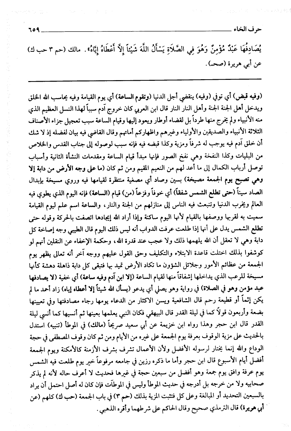 (وفيه قبض) أي توفي وفيه ينقضي أجل الدنيا (وتقوم الساعة) أي يوم القيامة وفيه يحاسب الله الخلق ويدخل أهل الجنة الجنة وأهل النار النار قال ابن العربي : كان خروج آدم سببا لهذا النسل العظيم الذي منه الأنبياء ولم يخرج منها طردا بل لقضاء أوطار ويعود إليها وقيام الساعة سبب تعجيل جزاء الأصناف الثلاثة الأنبياء والصديقين والأولياء وغيرهم وإظهاركم أماتهم وقال القاضي : فيه بيان لفضله إذ لا شك أن خلق آدم فيه يوجب له شرفا ومزية وكذا قبضه فيه فإنه سبب لوصوله إلى جناب القدس والخلاص من البليات وكذا النفخة وهي نفخ الصور فإنها مبدأ قيام الساعة ومقدمات النشأة الثانية وأسباب توصل أرباب الكمال إلى ما أعد لهم من النعيم المقيم ومن ثم كان (ما على) وجه (الأرض من دابة إلا وهي تصبح يوم الجمعة مصيخة) بسين وصاد أي مصغية منتظرة لقيامها فيه وروى مسيخة بإبدال الصاد سينا (حتى تطلع الشمس شفقا) أي خوفا وفزعا (من) قيام (الساعة) فإنه اليوم الذي يطوى فيه العالم ويخر ب الدنيا وتنبعث فيه الناس إلى منازلهم من الجنة والنار ، والساعة اسم علم ليوم القيامة سميت به لقربها ووصفها بالقيام لأنها اليوم ساكنة وإذا أراد الله إيجادها اتصفت بالحركة وقوله حتى تطلع الشمس يدل على أنها إذا طلعت عرفت الدواب أنه ليس ذلك اليوم قال الطيبي : وجه إصاخة كل دابة وهي لا تعقل أن الله يلهمها ذلك ولا عجب عند قدرة الله ، وحكمة الإخفاء عن الثقلين أنهم لو كوشفو بذلك اختلت قاعدة الابتلاء والتكليف وحق القول عليهم ووجه آخر أنه تعالى يظهر يوم الجمعة من عظائم الأمور وجلائل الشؤون ما تكاد الأرض تميد بها فتبقى كل دابة ذاهلة دهشة كأنها مسيخة لمرعب الذي يداخلها إشفاقا منها لقيام الساعة (إلا ابن آدم وفيه ساعة) أي خفية (لا يصادفها عبد مؤمن وهو في الصلاة) في رواية وهو يصلي أي يدعو (يسأل الله شيئا إلا أعطاه إياه) زاد أحمد ما لم يكن إثما أو قطيعة رحم قال الشافعية : ويسن الإكثار من الدعاء يومها رجاء مصادفتها وفي تعيينها بضعة وأربعون قولا كما في ليلة القدر قال البيهقي : فكان النبي يعلمها بعينها ثم أنسيها كما أنسي ليلة