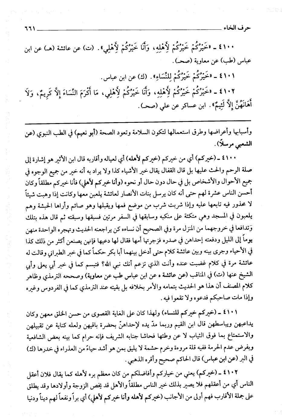 4102 (خيركم) يعني من خياركم وأفاضلكم من كان معظم بره لأهله كما يقال فلان أعقل الناس أي من أعقلهم فلا يصير بذلك خير الناس مطلقا والأهل قد يخص الزوجة وأولادها وقد يطلق على جملة الأقارب فهم أولى من الأجانب (خيركم لأهله وأنا خيركم لأهلي) أي برا ونفعا لهم دينا ودينا