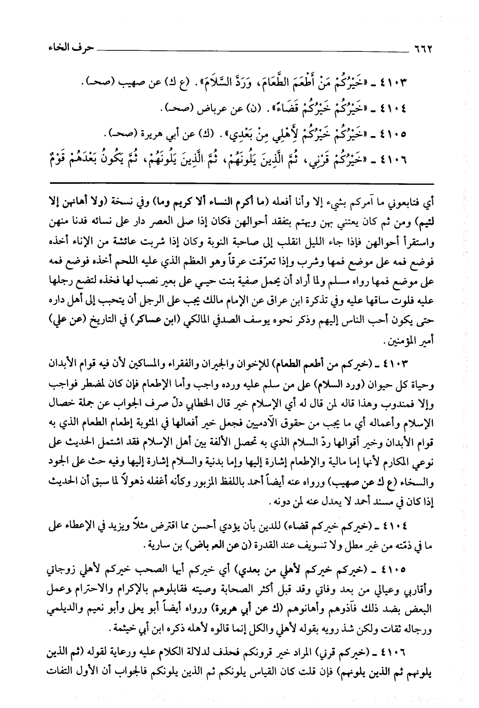 4104 (خيركم خيركم قضاء) للدين بأن يؤدي أحسن مما اقترض مثلا ويزيد في الإعطاء على ما فيه ذمته من غير مطل ولا تسويف عند القدرة (ن عن العرباض) بن سارية.