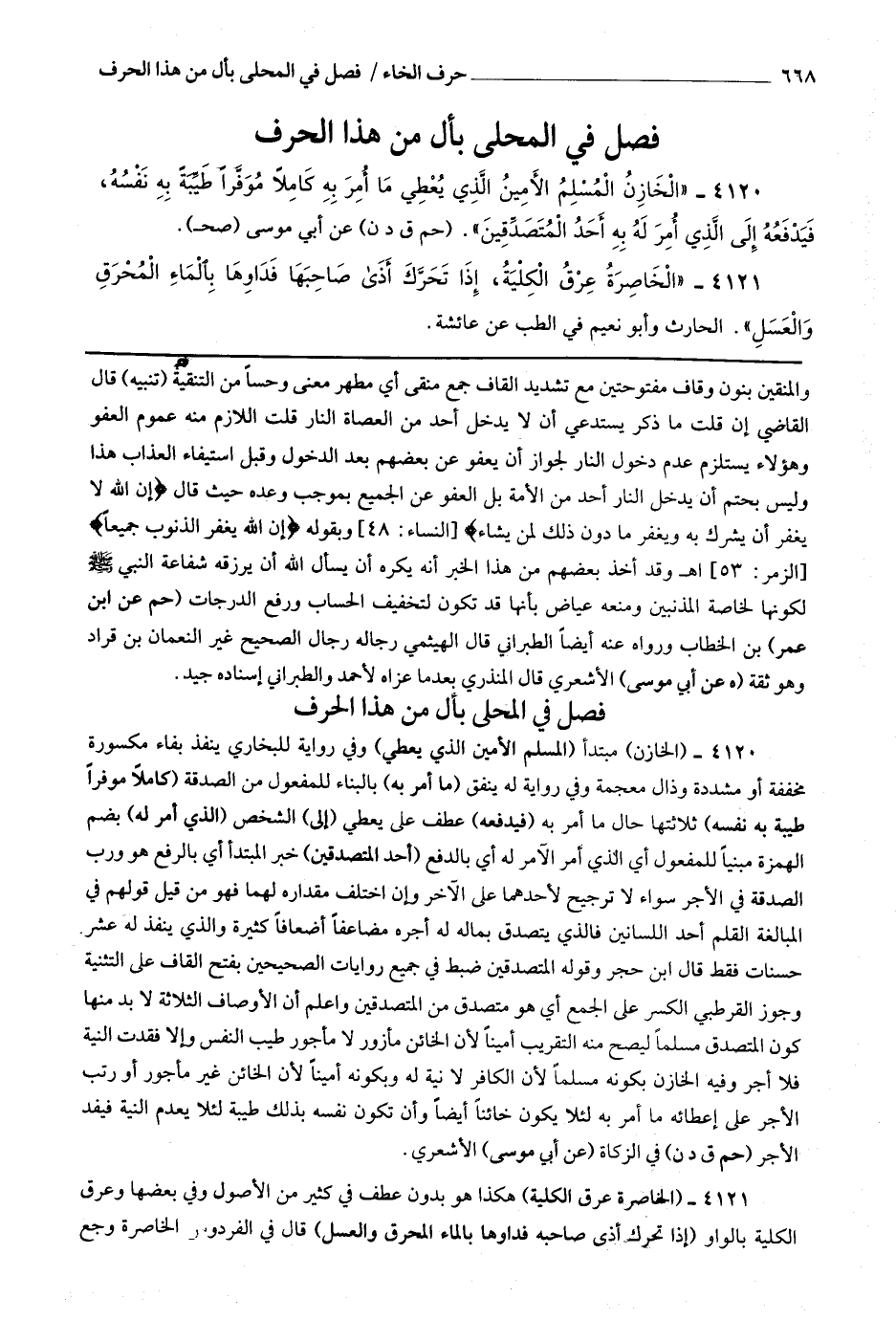 4120 (الخازن) مبتدأ (المسلم الأمين الذي يعطي) وفي رواية للبخاري ينفذ بفاء مكسورة مخففة أو مشددة وذال معجمة وفي رواية له ينفق (ما أمر به) بالبناء للمفعول من الصدقة (كاملا موفرا طيبة به نفسه) ثلاثتها حال ما أمر به (فيدفعه) عطف على يعطي (إلى) الشخص (الذي أمر له) بضم الهمزة مبنيا للمفعول أي الذي أمر الآمر له أي بالدفع (أحد المتصدقين) خبر المبتدأ أي بالرفع هو ورب الصدقة في الأجر سواء ترجيح لأحدهما على الآخر وإن اختلف مقداره لهما فهو من قبيل قولهم في المبالغة القلم أحد اللسانين فالذي يتصدق بماله له أجره مضاعفا أضعافا كثيرة والذي ينفذ له عشر حسنات فقط قال ابن حجر: وقوله المتصدقين ضبط في جميع روايات الصحيحين بفتح القاف على التثنية وجوز القرطبي الكسر على الجمع أي هو متصدق من المتصدقين واعلم أن الأوصاف الثلاثة لا بد منها
