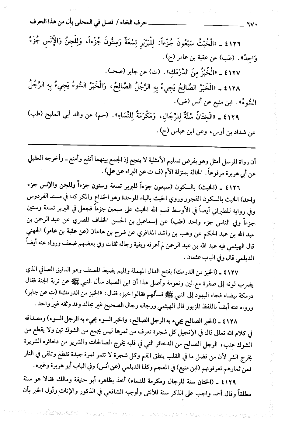 4126 (الخبث) بالسكون (سبعون جزءا للبربر تسعة وستون جزءا وللجن والإنس جزء واحد) الخبث بالسكون الفجور وروى الخبث بالباء الموحدة وهو الخداع والمكر كذا في مسند الفردوس وفي رواية للطبراني أيضا في الأوسط قسم الله الخبث على سبعين جزءا فجعل في البربر تسعة وستين جزءا وفي الناس جزء واحد (طب) عن إسماعيل بن الحسن الخفاف المصري عن عبد الرحمن بن عبد الله بن عبد الحكم عن وهب بن راشد المغافري عن شرح بن هاعان (عن عقبة بن عامر) الجهني قال الهيثمي : قيه عبد الله بن عبد الرحمن لم أعرفه وبقية رجاله ثقات وفي بعضهم ضعف ورواه عنه أيضا الديلمي قال : وفي الباب عثمان.