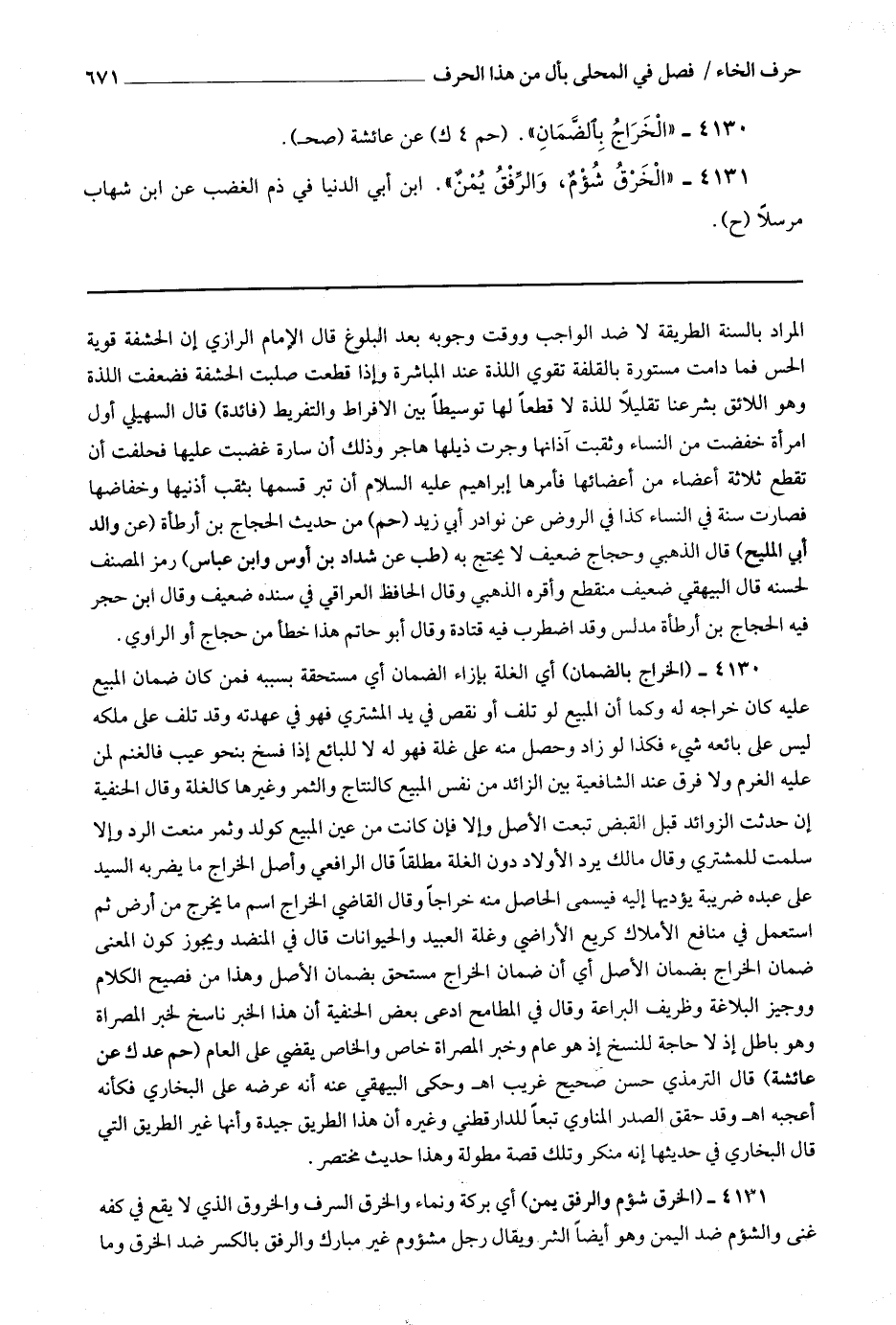 4130 (الخراج بالضمان) أي الغلة بإزاء الضمان أي مستحقة بسببه فمن كان ضمان المبيع عليه كان خراجه له وكما أن المبيع لو تلف أو نقص في يد المشتري فهو في عهدته وقد تلف على ملكه ليس على بائعه شئ فكذا لو زاد وحصل منه على غلة فهو له لا للبائع إذا فسخ بنحو عيب فالغنم لمن عليه الغرم ولا فرق عند الشافعية بين الزائد من نفس المبيع كالنتاج والثمر وغيرها كالغلة وقال الحنفية إن حدثت الزوائد قبل القبض تبعت الأصل وإلا فإن كانت من عين المبيع كولد وثمر منعت الرد وإلا سلمت للمشتري وقال مالك : يرد الأولاد دون الغلة مطلقا قال الرافعي : وأصل الخراج ما يضربه السيد