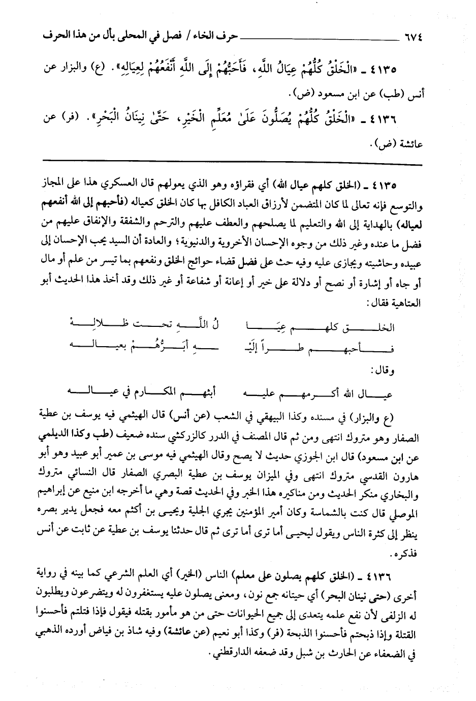 4135 (الخلق كلهم عيال الله) أي فقراؤه وهو الذي يعولهم قال العسكري : هذا على المجاز والتوسع فإنه تعالى لما كان المتضمن لأرزاق العباد الكافل بها كان الخلق كعياله (فأحبهم إلى الله أنفعهم لعياله) بالهداية إلى الله والتعليم لما يصلحهم والعطف عليهم والترحم والشفقة والإنفاق عليهم من فضل ما عنده وغير ذلك من وجوه الإحسان الأخروية والدنيوية والعادة أن السيد يحب الإحسان إلى عبيده وحاشيته ويجازي عليه وفيه حث على فضل قضاء حوائج الخلق ونفعهم بما تيسر من علم أو مال أو جاه أو إشارة أو نصح أو دلالة على خير أو إعانة أو شفاعة أو غير ذلك وقد أخذ هذا الحديث آبو العتاهية فقال الخلق كلهم عيال * الله تحت ظلاله * فاحبهم طرا إليه * أبرهم بعياله وقال : عيال الله أكرمهم عليه * أثبهم المكارم في عياله (ع والبزار) في مسنده وكذا البيهقي في الشعب (عن أنس) قال الهيثمي : فيه يوسف بن عطية الصفار وهو متروك انتهى ومن ثم قال المصنف في الدرر كالزركشي : سنده ضعيف (طب وكذا الديلمي عن ابن مسعود) قال ابن الجوزي : حديث لا يصح وقال الهيثمي : فيه موسى بن عمير أبو عبيد وهو أبو هارون القدسي متروك انتهى.