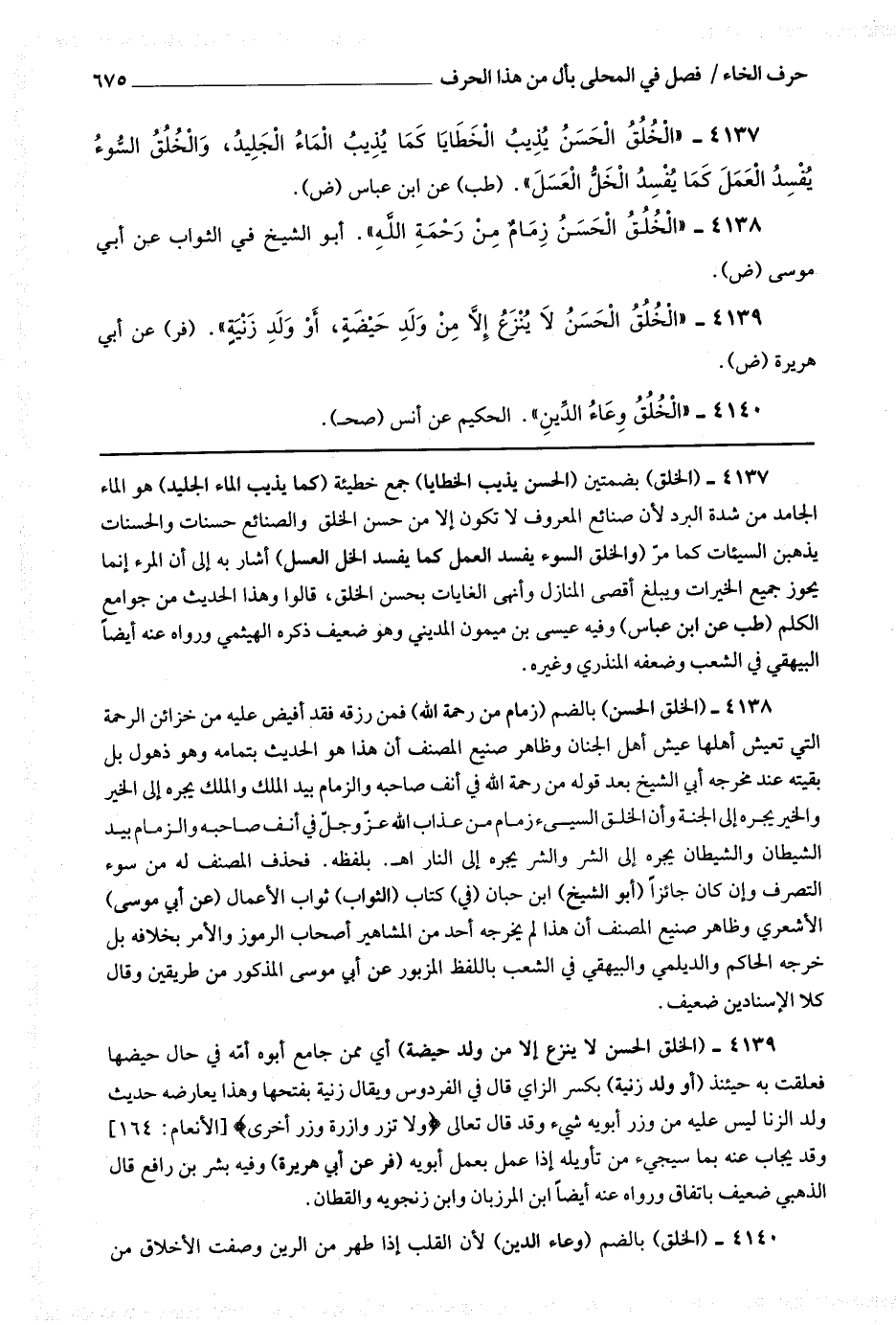 4137 (الخلق) بضمتين (الحسن يذيب الخطايا) جمع خطيئة (كما يذيب الماء الجليد) هو الماء الجامد من شدة البرد لأن صنائع المعروف لا تكون إلا من حسن الخلق والصنائع حسنات والحسنات يذهبن السيئات كما مر (والخلق السوء يفسد العمل كما يفسد الخل العسل) أشار به إلى أن المرء إنما يحوز جميع الخيرات ويبلغ أقصى المنازل وأبهى الغايات بحسن الخلق ، قالوا : وهذا الحديث من جوامع الكلم (طب عن ابن عباس) وفيه عيسى بن ميمون المديني وهو ضعيف ذكره الهيثمي ورواه عنه أيضا البيهقي في الشعب وضعفه المنذري وغيره.