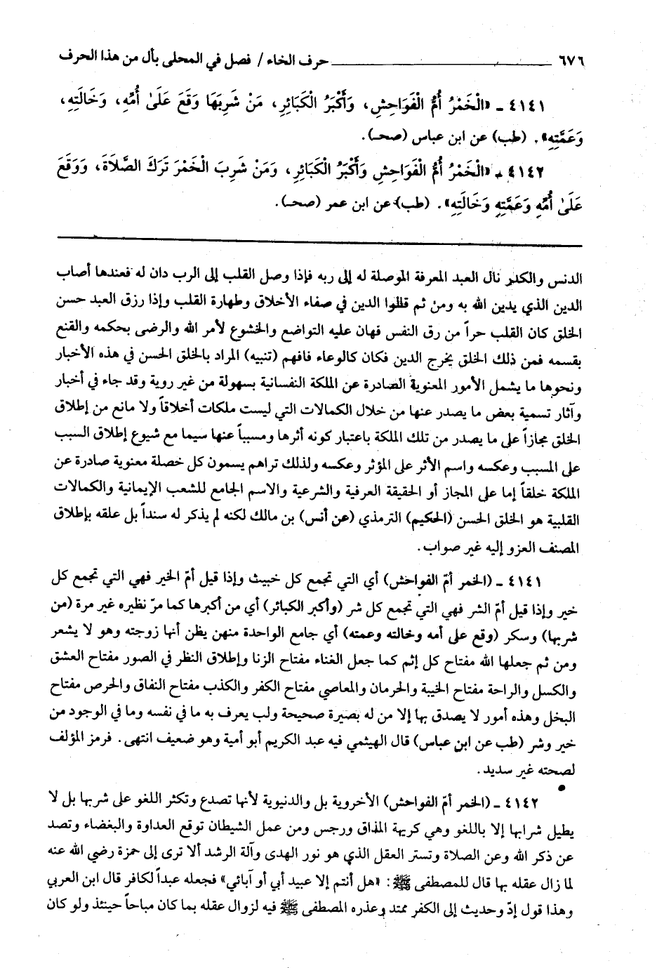 4141 (الخمر أم الفواحش) أي التي تجمع كل خبيث وإذا قيل أم الخير فهي التي تجمع كل خير وإذا قيل أم الشر فهي التي تجمع كل شر (وأكبر الكبائر) أي من أكبرها كما مر نظيره غير مرة (من شربها) وسكر (وقع على أمه وخالته وعمته) أي جامع الواحدة منهن يظن أنها زوجته وهو لا يشعر ومن ثم جعلها الله مفتاح كل إثم كما جعل الغناء مفتاح الزنا وإطلاق النظر في الصور مفتاح العشق والكسل والراحة مفتاح الخيبة والحرمان والمعاصي مفتاح الكفر والكذب مفتاح النفاق والحرص مفتاح البخل وهذه أمور لا يصدق بها إلا من له بصيرة صحيحة ولب يعرف به ما في نفسه وما في الوجود من خير وشر (طب عن ابن عباس) قال الهيثمي : فيه عبد الكريم أبو أمية وهو ضعيف انتهى.