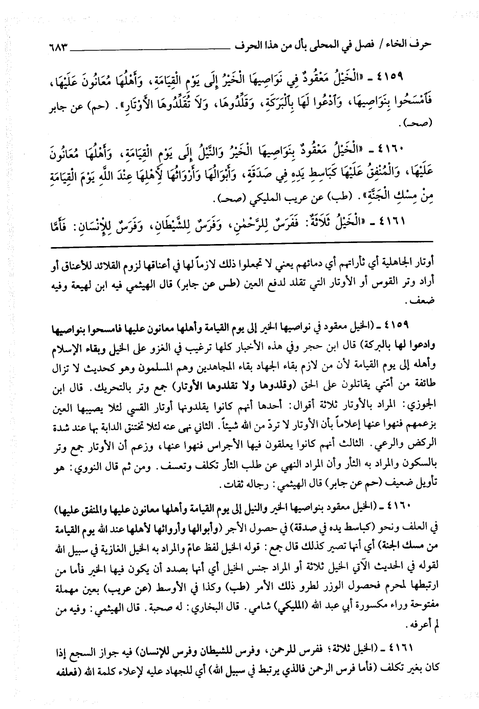 4159 (الخيل معقود في نواصيها الخير إلى يوم القيامة وأهلها معانون عليها فامسحوا بنواصيها وادعوا لهبالبركة) قال ابن حجر : وفي هذه الأخبار كلها ترغيب في الغزو على الخيل وبقاء الإسلام وأهله إلى يوم القيامة لأن من لازم بقاء الجهاد بقاء المجاهدين وهم المسلمون وهو كحديث لا تزال