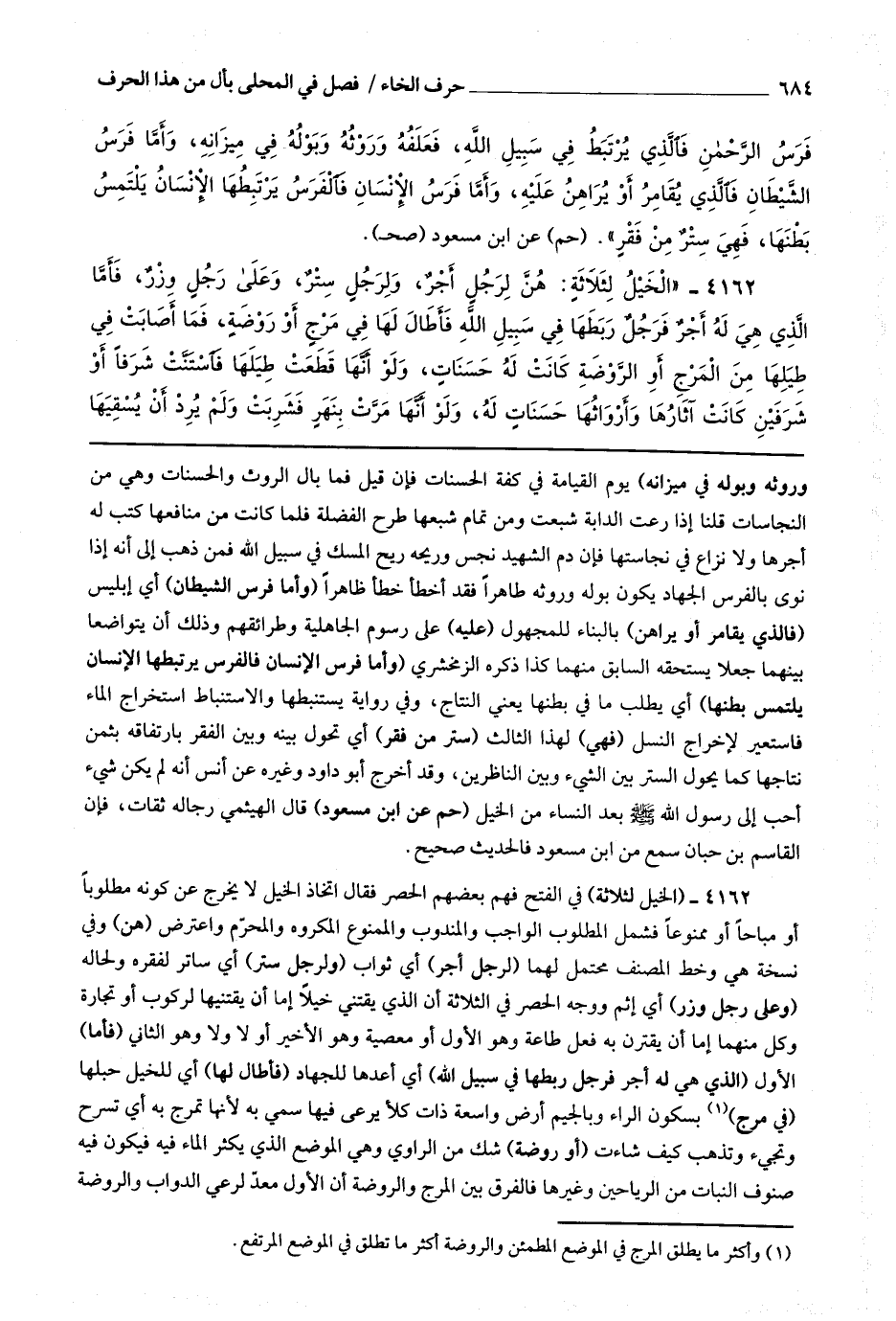 4162 (الخيل لثلاثة) في الفتح فهم بعضهم الحصر فقال : اتخاذ الخيل لا يخرج عن كونه مطلوبا أو مباحا أو ممنوعا فشمل المطلوب الواجب والمندوب والممنوع المكروه والمحرم واعترض (هن) وفي نسخة هي وخط المصنف محتمل لهما (لرجل أجر) أي ثواب (ولرجل ستر) أي ساتر لفقره ولحاله (وعلى رجل وزر) أي إثم ووجه الحصر في الثلاثة أن الذي يقتني خيلا إما أن يقتنيها لركوب أو تجارة وكل منهما إما أن يقترن به فعل طاعة وهو الأول أو معصية وهو الأخير أو لا ولا وهو الثاني (فأما) الأول (الذي هي له أجر فرجل ربطها في سبيل الله) أي أعدها للجهاد (فأطال لها) أي للخيل حبلها (في مرج) (1) بسكون الراء وبالجيم أرض واسعة ذات كلأ يرعى فيها سمي به لأنها تمرح به أي تسرح وتجئ وتذهب كيف شاءت (أو روضة) شك من الراوي وهي الموضع الذي يكثر الماء فيه فيكون فيه صنوف النبات من الرياحين وغيرها فالفرق بين المرج والروضة أن الأول معد لرعي الدواب والروضة