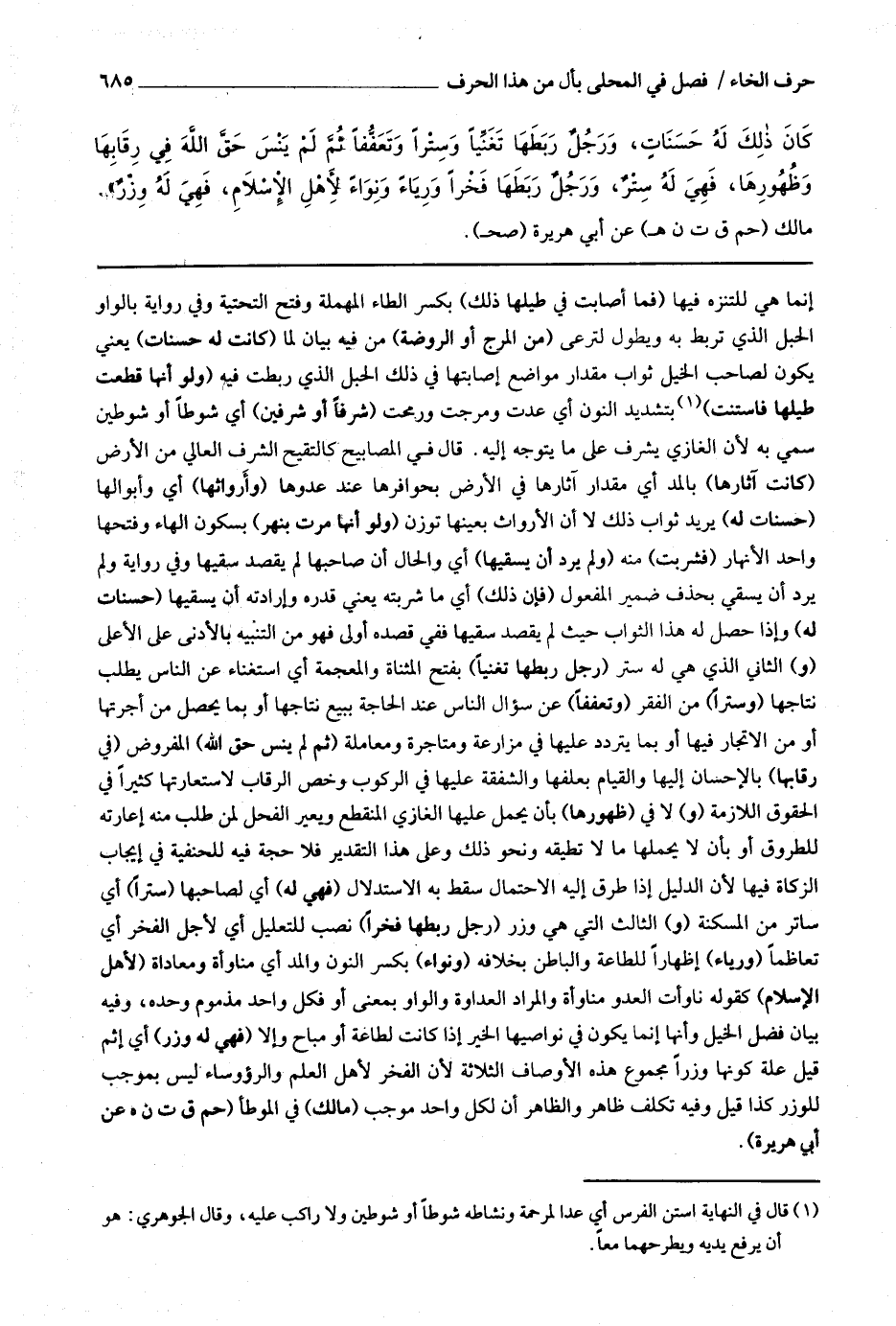 واحد الأنهار (فشربت) منه (ولم يرد أن يسقيها) أي والحال أن صاحبها لم يقصد سقيها وفي رواية ولم يرد أن يسقي بحذف ضمير المفعول (فإن ذلك) أي ما شربته يعني قدره وإرادته أن يسقيها (حسنات له) وإذا حصل له هذا الثواب حيث لم يقصد سقيها ففي قصده أولى فهو من التنبيه بالأدنى على الأعلى (و) الثاني الذي هي له ستر (رجل ربطها تغنيا) بفتح المثناة والمعجمة أي استغناء عن الناس يطلب نتاجها (وسترا) من الفقر (وتعففا) عن سؤال الناس عند الحاجة ببيع نتاجها أو بما يحصل من أجرتها أو من الاتجار فيها أو بما يتردد عليها في مزارعة ومتاجرة ومعاملة (ثم لم ينس حق الله) المفروض (في رقابها) بالإحسان إليها والقيام بعلفها والشفقة عليها في الركوب وخص الرقاب لاستعارتها كثيرا في الحقوق اللازمة (و) لا في (ظهورها) بأن يحمل عليها الغازي المنقطع ويعير الفحل لمن طلب منه إعارته للطروق أو بأن لا يحملها ما لا تطيقه ونحو ذلك وعلى هذا التقدير فلا حجة فيه للحنفية في إيجاب الزكاة فيها لأن الدليل إذا طرق إليه الاحتمال سقط به الاستدلال (فهي له) أي لصاحبها (سترا) أي ساتر من المسكنة (و) الثالث التي هي وزر (رجل ربطها فخرا) نصب للتعليل أي لأجل الفخر أي تعاظما ورياء) إظهارا للطاعة والباطن بخلافه (ونواء) بكسر النون والمد أي منا وأو معاداة (لأهل الإسلام) كقوله ناوأت العدو مناوأة والمراد العداوة والواو بمعنى أو فكل واحد مذموم وحده وفيه بيان فضل الخيل وأنها إنما يكون في نواصيها الخير إذا كانت لطاعة أو مباح وإلا (فهي له وزر) أي إثم قيل علة كونها وزرا مجموع هذه الأوصاف الثلاثة لأن الفخر لأهل العلم والرؤساء ليس بموجب للوزر كذاقيل وفيه تكلف ظاهر والظاهر أن لكل واحد موجب.