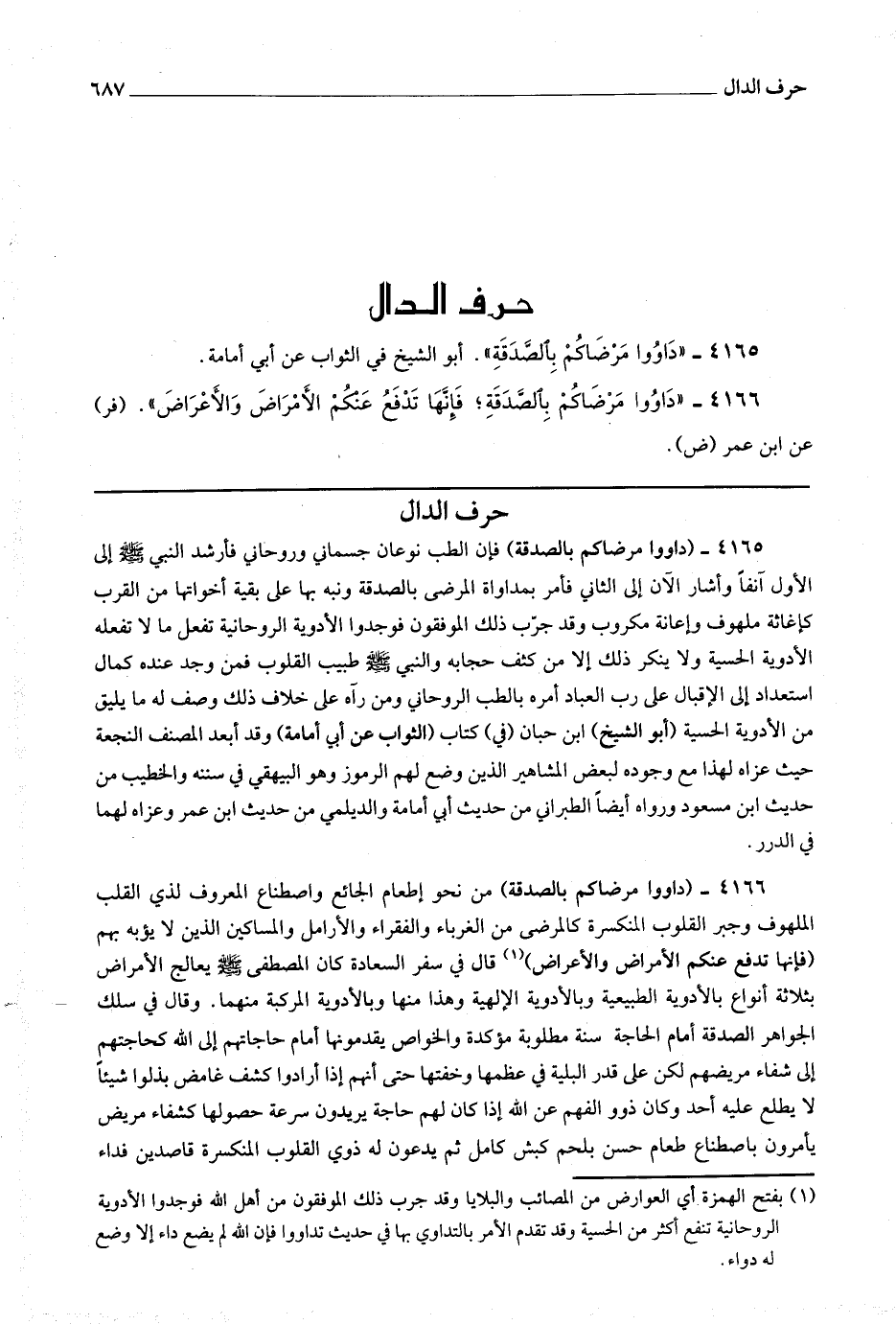 4165 (داووا مرضاكم بالصدقة) فإن الطب نوعان جسماني وروحاني فأرشد النبي صلى الله عليه وسلم إلى الأول آنفا وأشار الآن إلى الثاني فأمر بمداواة المرضى بالصدقة ونبه بها على بقية أخواتها من القرب كإغاثة ملهوف وإغاثة مكروب وقد جرب ذلك الموفقون فوجدوا الأدوية الروحانية تفعل ما لا تفعله الأدوية الحسية ولا ينكر ذلك إلا من كشف حجابه والنبي صلى الله عليه وسلم طبيب القلوب فمن وجد عنده كمال استعداد إلى الإقبال على رب العباد أمره بالطب الروحاني ومن رآه على خلاف ذلك وصف له ما يليق من الأدوية الحسية.