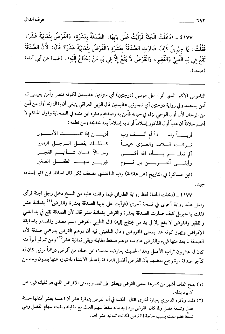4177 (دخلت الجنة) لفظ رواية الطبراني فيما وقفت عليه من النسخ دخل رجل الجنة فرأى ولعل هذه رواية أخرى في نسخة أخرى (فرأيت على بابها الصدقة بعشرة والقرض (1 بثمانية عشر فقلت يا جبريل كيف صارت الصدقة بعشرة والقرض بثمانية عشرة قال لأن الصدقة تقع في يد الغني والفقير والقرض لا يقع إلا في يد من يحتاج إليه) قال الطيبي : القرض اسم مصدر والمصدر بالحقيقة الإقراض ويجوز كونه هنا بمعنى المقروض وقال البلقيني : فيه أن درهم القرض بدرهمي صدقة لأن الصدقة لم يعد منها شئ والقرض عاد منه درهم فسقط مقابله وبقي ثمانية عشر (2) ومن ثم لو أبرأ منه كان له عشرون ثواب الأصل وهذا الحديث يعارضه حديث ابن حبان من أقرض درهما مرتين كان له كأجر صدقة مرة وجمع بعضهم بأن القرض أفضل الصدقة باعتبار الابتداء بامتيازه عنها بصون وجه من