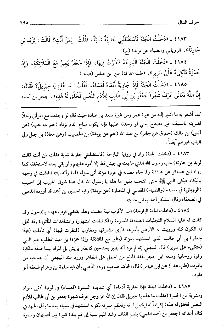 4184 (دخلت الجنة البارحة) اسم لأقرب ليلة مضت وهذا يقتضي قرب عهده بالدخول وقد كانت له عليه السلام التجليات الصادقة المعلومة والمكاشفات المشهورة والمشاهدات المأثورة وقد تجلى له الكون كله وزويت له الأرض بأسرها فأري مشارقها ومغاربها (فنظرت فيها) أي تأملت (فإذا جعفر) بن أبي طالب الذي استشهد بمؤتة (يطير مع الملائكة وإذا حمزة) بن عبد المطلب عم النبي (متكئ على سرير) قال السهيلي : إنه لم يرد أنه يطير بجناحين كالطير بريش بل المراد بهما صفة ملكية وقوة روحانية ومنعه ابن حجر بفقد المانع من الحمل على الظاهر وورد عند البيهقي أن جناحيه من ياقوت (طب عد ك عن ابن عباس) قال الحاكم : صحيح ورده الذهبي بأن فيه سلمة بن وهرام ضعفه أبو داود.