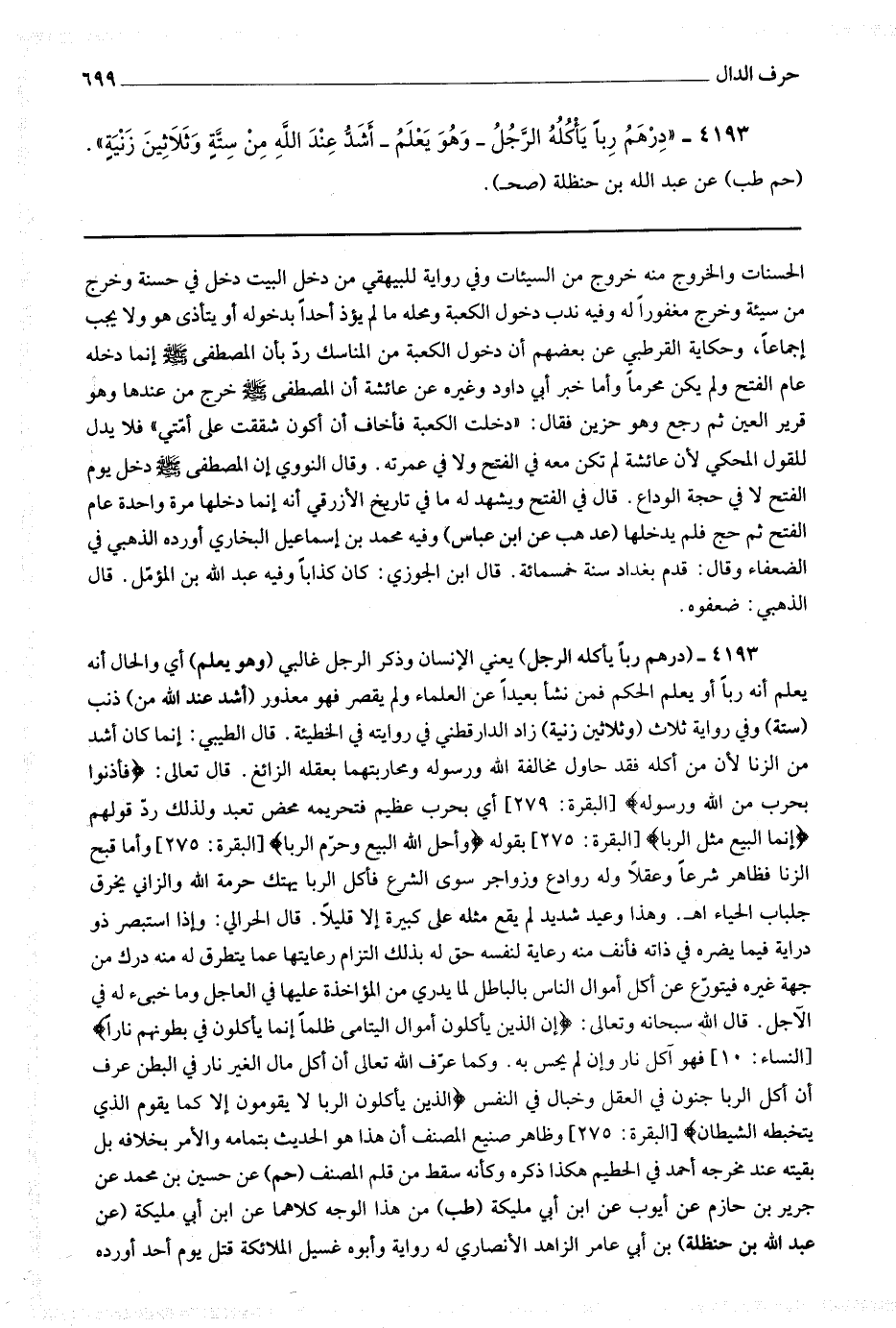 قال الذهبي : ضعفوه 4193 (درهم ربا يأكله الرجل) يعني الإنسان وذكر الرجل غالبي (وهو يعلم) أي والحال أنه يعلم أنه ربا أو يعلم الحكم فمن نشأ بعيدا عن العلماء ولم يقصر فهو معذور (أشد عند الله من) ذنب (ستة) وفي رواية ثلاث (وثلاثين زنية) زاد الدارقطني في روايته في الخطيئة.