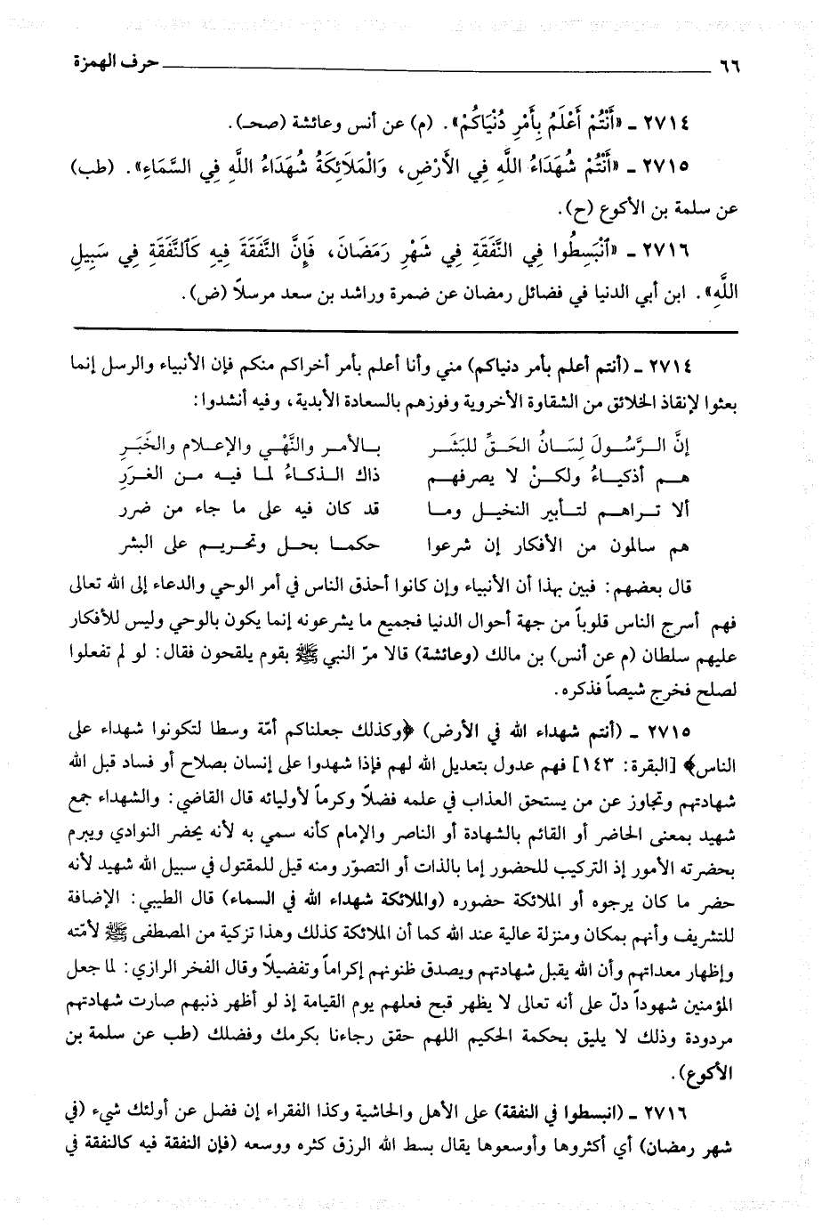 2724 (أنزل القرآن على سبعة أحرف) اختلف فيه على نحو أربعين قولا من أحسنها ما قرره الحرالي حيث قال : الجوامع التي حلت في الأولين بداياتها وتمت عند المصطفى صلى الله عليه وسلم نهاياتها هي صلاح الدين والدنيا والمعاد وفي كل صلاح إقدام وإحجام فتصير الثلاثة ستة هي حروف القرآن الستة التي لم يبرح يستزيدها من ربه حرفا حرفا فلما استوفى الستة وهبه ربه سابعا جامعا فرد الأزواج له فتم إنزاله على سبعة أحرف وتفصيل هذه السبعة تكفل بتبيانه الحديث الآتي بعده بخمسة أحاديث المغني عن طلبتها بالحدس والتأويل المبطل لشعب تلك الأقاويل وفي بيانه شفاء العي وثلج اليقين (حم ت عن