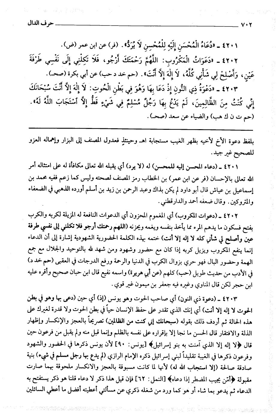 4203 (دعوة ذي النون) أي صاحب الحوت وهو يونس (إذا) أي حين (دعى بها وهو في بطن الحوت لا إله إلا أنت) أي إنك الذي تقدر على حفظ الإنسان حيا في باطن الحوت ولا قدرة لغيرك على هذه الحالة ثم أردف ذلك بقوله (سبحانك إني كنت من الظالمين) تصريحا بالعجز والانكسار وإظهار الذلة والافتقار قال الحسن : ما نجا إلا بإقراره على نفسه بالظلم وإنما قبل منه ولم يقبل من فرعون حين قال * (لا إله إلا الذي آمنت به بنو إسرائيل) * لأن يونس ذكرها في الحضور والشهود وفرعون ذكرها في الغيبة تقليد البني إسرائيل ذكره الإمام الرازي (لم يدع بها رجل مسلم في شئ) بنية صادقة صالحة (إلا استجاب الله له) لأنها لما كانت مسبوقة بالعجز والانكسار ملحوقة بهما صارت مقبولة * (أمن يجيب المضطر إذا دعاه) * فإن قيل : هذا ذكر لا دعاء قلنا : هو ذكر يستفتح به الدعاء ثم يدعو بما شاء أو هو كما ورد من شغله ذكري عن مسئلتي أعطيته أفضل ما أعطي السائلين