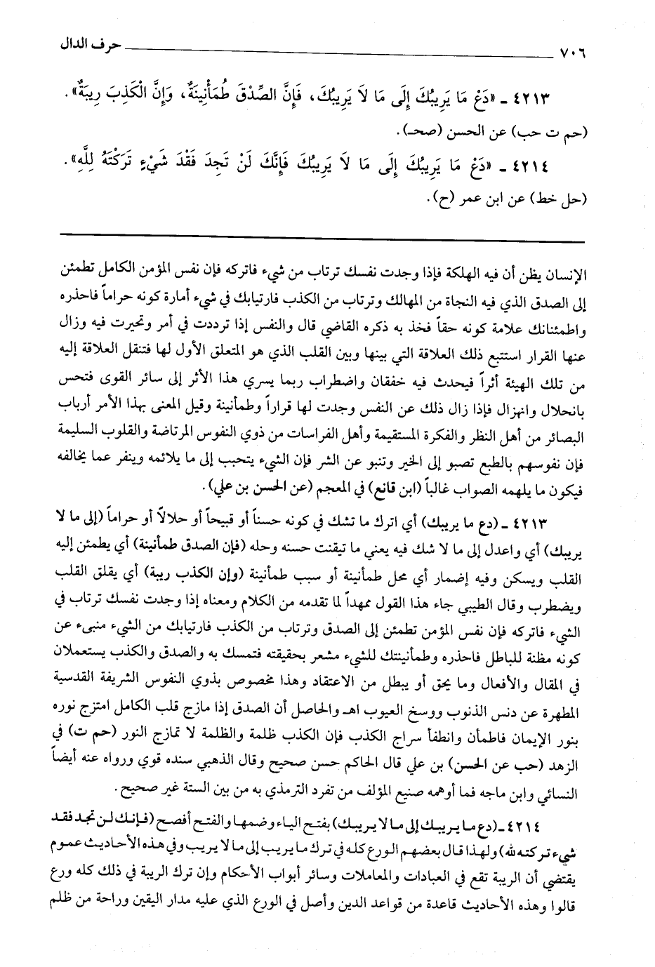 4213 (دع ما يريبك) أي اترك ما تشك في كونه حسنا أو قبيحا أو حلالا أو حراما (إلى ما لا يريبك) أي واعدل إلى ما لا شك فيه يعني ما تيقنت حسنه وحله (فإن الصدق طمأنينة) أي يطمئن إليه القلب ويسكن وفيه إضمار أي محل طمأنينة أو سبب طمأنينة (وإن الكذب ريبة) أي يقلق القلب ويضطرب وقال الطيبي : جاء هذا القول ممهدا لما تقدمه من الكلام ومعناه إذا وجدت نفسك ترتاب في الشئ فاتركه فإن نفس المؤمن تطمئن إلى الصدق وترتاب من الكذب فارتيابك من الشئ منبئ عن كونه مظنة للباطل فاحذره وطمأنينتك للشئ مشعر بحقيقته فتمسك به والصدق والكذب يستعملان في المقال والأفعال وما يحق أو يبطل من الاعتقاد وهذا مخصوص بذوي النفوس الشريفة القدسية المطهرة عن دنس الذنوب ووسخ العيوب اه والحاصل أن الصدق إذا مازج قلب الكامل امتزج نوره بنور الأيمان فاطمأن وانطفأ سراج الكذب فإن الكذب ظلمة والطلمة لا تمازج النور (حم ت) في الزهد (حب عن الحسن) بن علي قال الحاكم : حسن صحيح وقال الذهبي : سنده قوي ورواه عنه أيضا النسائي وابن ماجه فما أوهمه صنيع المؤلف من تفرد الترمذي به من بين الستة غير صحيح.