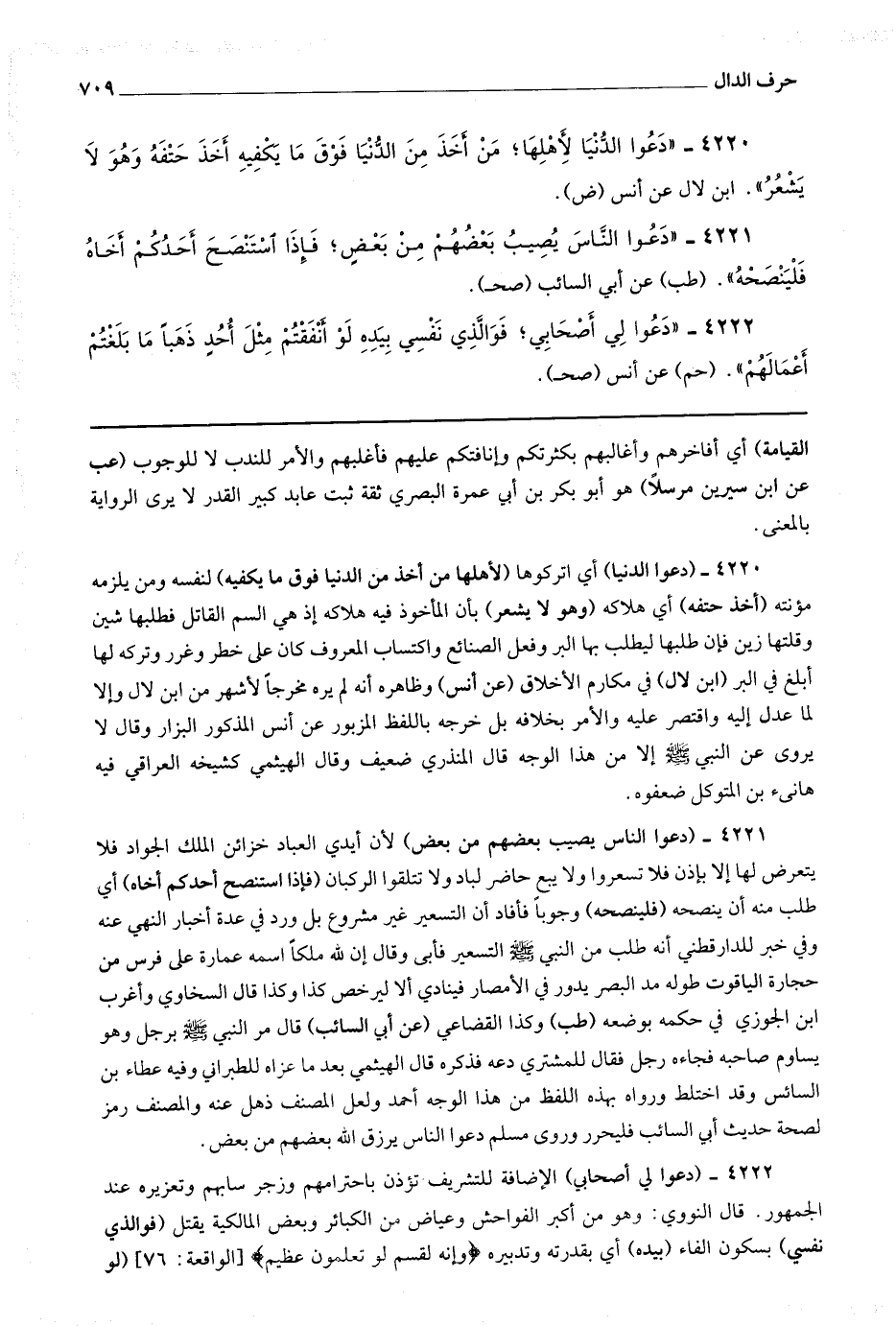 4220 (دعوا الدنيا) أي اتركوها (لأهلها من أخذ من الدنيا فوق ما يكفيه) لنفسه ومن يلزمه مؤونته (أخذ حتفه) أي هلاكه (وهو لا يشعر) بأن المأخوذ فيه هلاكه إذ هي السم القاتل فطلبها شين وقلتها زين فإن طلبها ليطلب بها البر وفعل الصنائع واكتساب المعروف كان على خطر وغرر وتركه لها أبلغ في البر (ابن لال) في مكارم الأخلاق (عن أنس) وظاهره أنه لم يره مخرجا لأشهر من ابن لال وإلا لما عدل إليه واقتصر عليه والأمر بخلافه بل خرجه باللفظ المزبور عن أنس المذكور البزار وقال : لا يروى عن النبي صلى الله عليه وسلم إلا من هذا الوجه قال المنذري : ضعيف وقال الهيثمي كشيخه العراقي : فيه هانئ بن المتوكل ضعفوه.