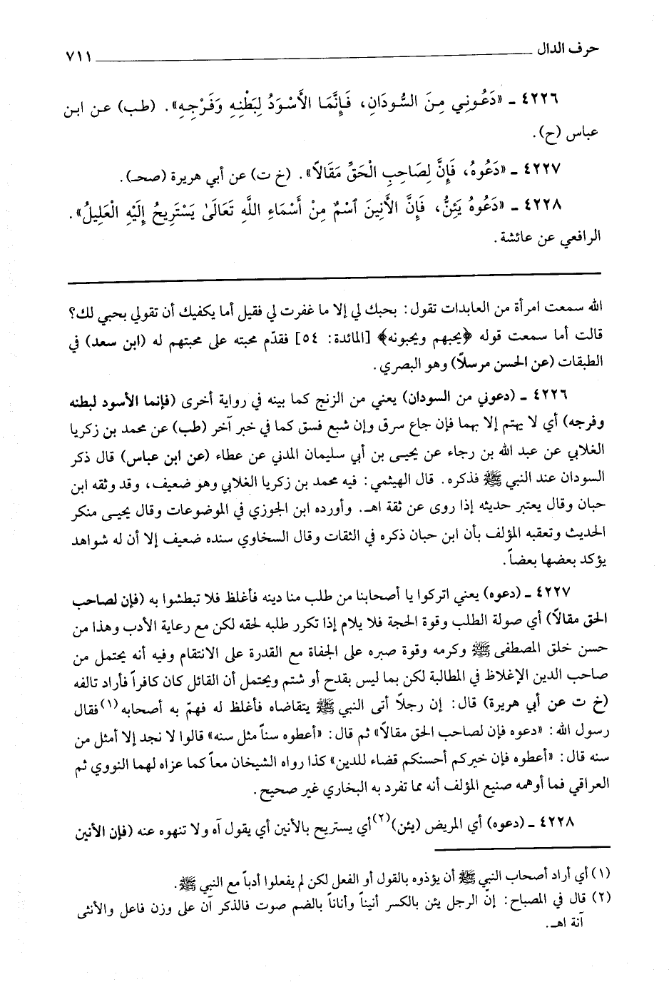 4226 (دعوني من السودان) يعني من الزنج كما بينه في رواية أخرى (فإنما الأسود لبطنه وفرجه) (1) أي لا يهتم إلا بهما فإن جاع سرق وإن شبع فسق كما في خبر آخر (طب) عن محمد بن زكريا الغلابي عن عبد الله بن رجاء عن يحيى بن أبي سليمان المدني عن عطاء (عن ابن عباس) قال : ذكر السودان عند النبي صلى الله عليه وسلم فذكره.