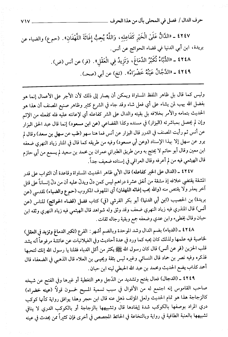 4249 (الدجال) فعال بفتح وتشديد من الدجل وهو التغطية أو غيرها وفي الفتح عن شيخه صاحب القاموس أنه اجتمع له من الأقوال في سبب تسمية المسيح خمسون قولا (عينه خضراء)