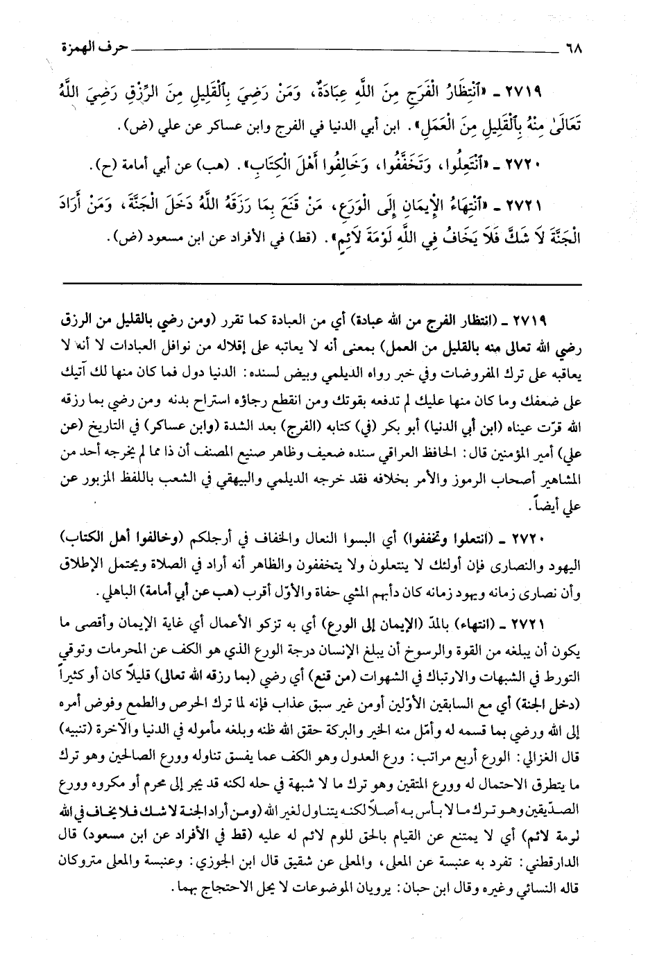 * (فائدة) * قال المؤلف : من خصائصه أن كتابه معجز ومحفوظ من التبديل والتحريف على ممر الدهور ومشتمل على ما اشتملت عليه الكتب وزيادة وجامع لكل شئ ومستغن عن غيره وميسر للحفظ ونزل منجما على سبعة أحرف وسبعة أبواب وبكل لغة عد هذه ابن النقيب وقراءته بكل حرف عشر حسنات عد هذه الزركشي (ابن الضريس عن سمرة) بن جندب ورواه عنه أيضا الطبراني والبزار لكن بلفظ ولا تجافوا عنه بدل تحاجوا فيه قال الهيثمي : وإسنادهما ضعيف اه فما أوهمه صنيع المؤلف من أنه لم يره مخرجا لأحد من المشاهير الذين وضع لهم الرموز غير جيد.