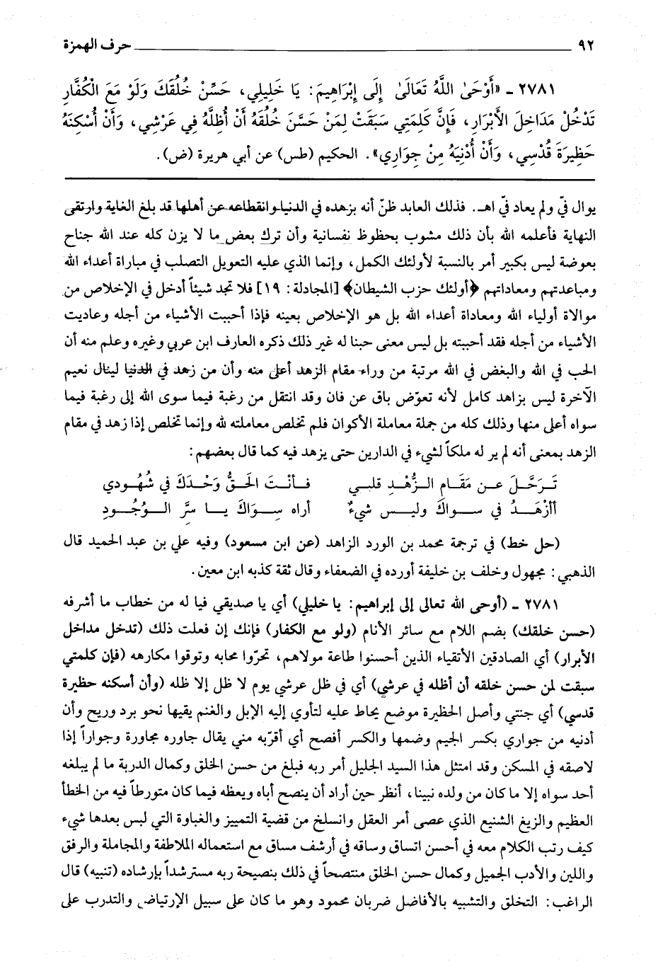 2789 (أوصيك أن تستحي من الله كما تستحي من الرجل الصالح من قومك) قال ابن جرير : هذا أبلغ موعظة وأبين دلالة بأوجز إيجاز وأوضح بيان إذ لا أحد من الفسقة إلا وهو يستحي من عمل القبيح عن أعين أهل الصلاح وذوي الهيئات والفضل أن يراه وهو فاعله والله مطلع على جميع أفعال خلقه فالعبد إذا استحى من ربه استحياءه من رجل صالح من قومه تجنب جميع المعاصي الظاهرة والباطنة فيا لها من وصية ما أبلغها وموعظة ما أجمعها.
