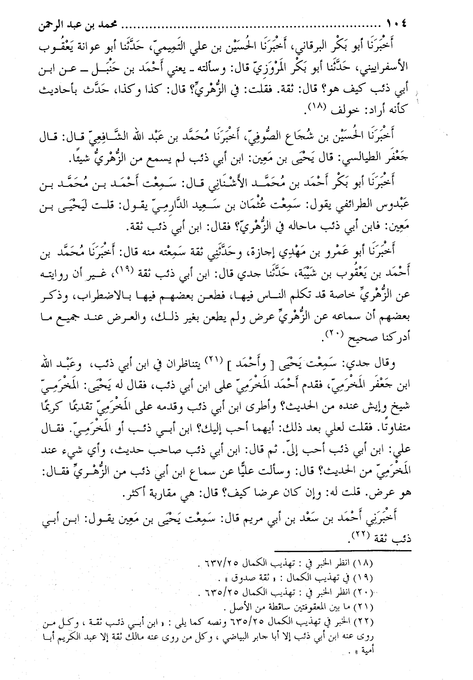 وَقَالَ جدي: سمعت يحيى [وأحمد] [4] يتناظران في ابن أبي ذئب، وعبد الله ابن جعفر المخرمي، فقدم أحمد المخرمي على ابن أبي ذئب، فقال له يحيى: المخرمي شيخ وأيش عنده من الحديث؟ وأطرى ابن أبي ذئب وقدمه على المخرميّ تقديما كريما متفاوتا. فقلت لعلي بعد ذلك: أيهما أحب إليك؟ ابن أبي ذئب أو المخرمي. فقال علي: ابن أبي ذئب أحب إلي. ثم قال: ابن أبي ذئب صاحب حديث، وأي شيء عند المخرمي من الحديث؟ قَالَ: وسألت عليا عن سماع ابن أبي ذئب من الزهري فقال: