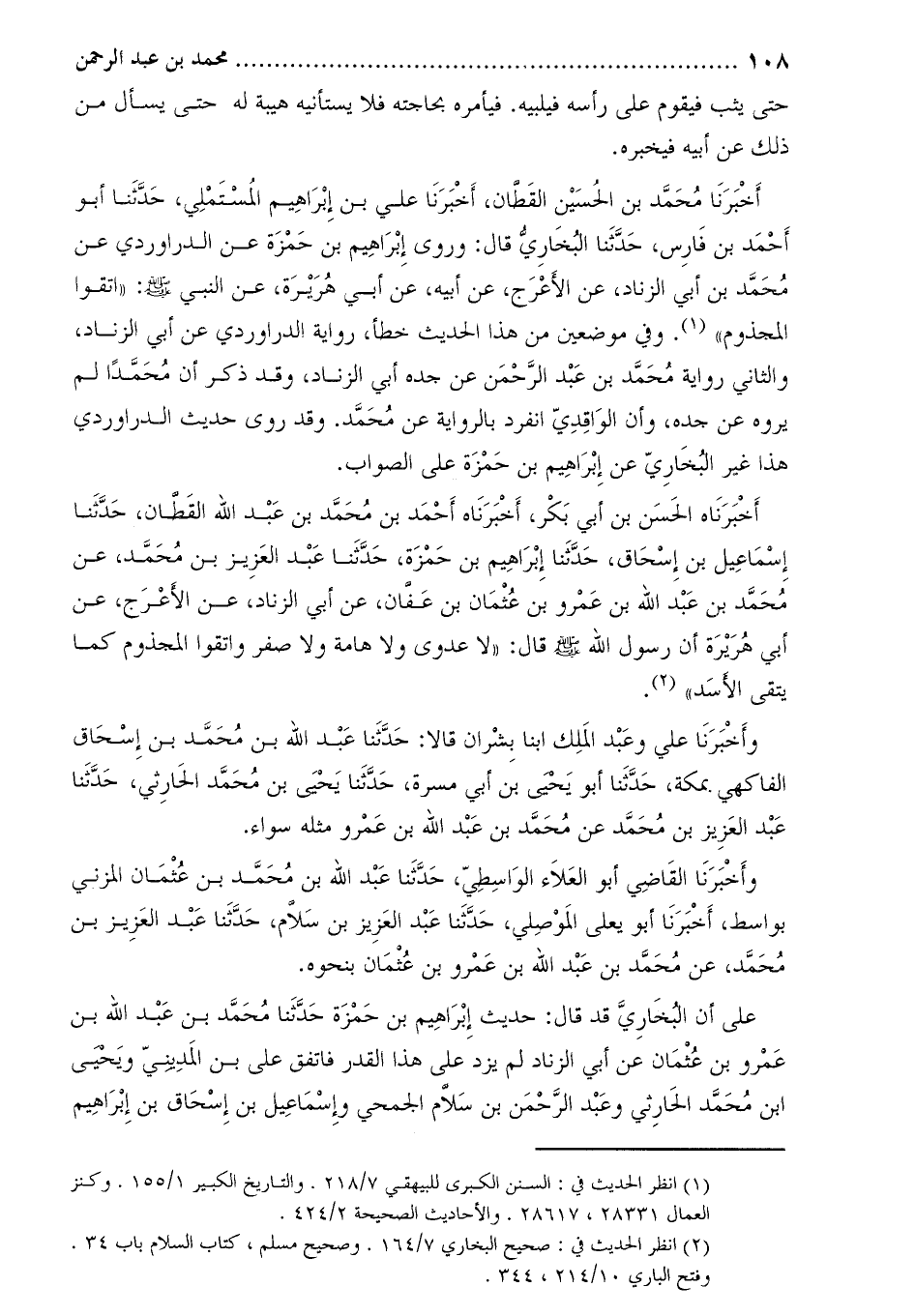 أَخْبَرَنَا مُحَمَّدُ بْنُ الحسين القطّان، أخبرنا علي بن إبراهيم المستملي، حدّثنا أبو أحمد بن فارس، حَدَّثَنَا الْبُخَارِيُّ قَالَ: وَرَوَى إِبْرَاهِيمُ بْنُ حَمْزَةَ عَنِ الدَّرَاوَرْدِيِّ عَنْ مُحَمَّدِ بْنِ أَبِي الزِّنَادِ، عن الأعرج، عَنْ أَبِيهِ، عَنْ أَبِي هُرَيْرَةَ، عَنِ النَّبِيِّ صلّى الله عليه وسلّم: «اتقوا المجذوم» [1]
