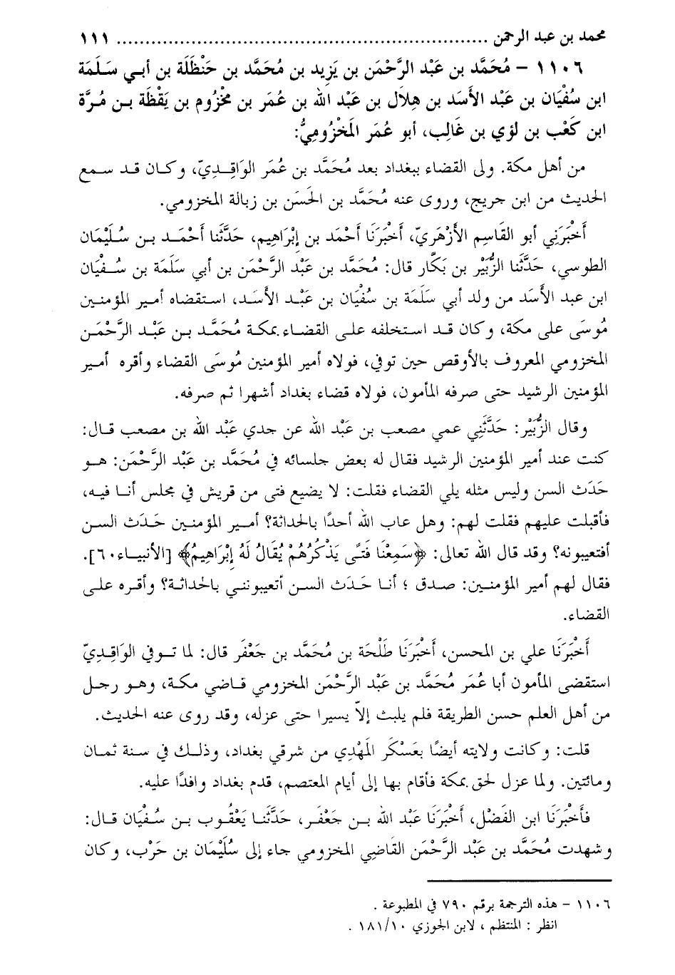 1106- محمد بن عبد الرحمن بن يزيد بن محمد بن حنظلة بن أبي سلمة ابن سفيان بن عبد الأسد بن هلال بن عَبْدِ اللَّهِ بْنِ عُمَر بن مخزوم بن يقظة بن مرّة ابن كعب بن لؤي بن غالب، أبو عمر المخزومي [1] :