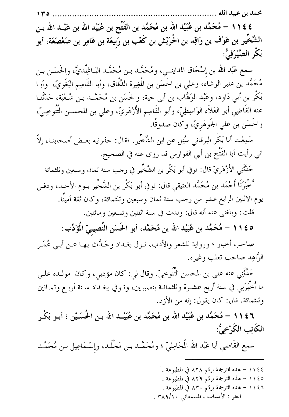 1144- مُحَمَّدُ بْنُ عُبَيْدِ اللَّهِ بْنِ مُحَمَّدِ بْنِ الفتح بْن عُبَيْد اللَّه بْن عَبْد اللَّهِ بْن الشخير بن عوف بن واقد بن الحريش بن كعب بن ربيعة بن عامر بن صعصعة، أبو بكر الصيرفي [1] :