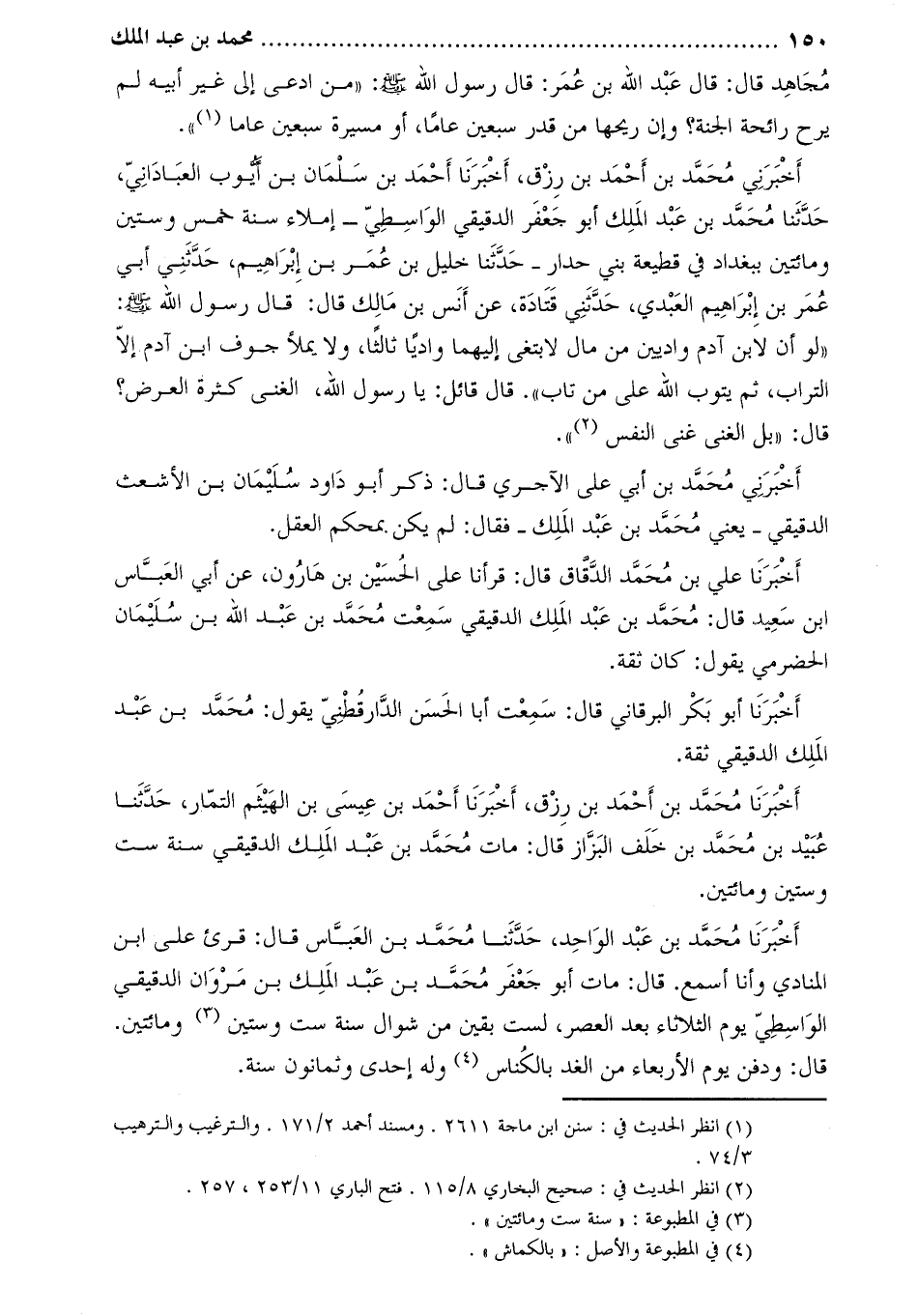. أَخْبَرَنِي مُحَمَّدُ بْنُ أَحْمَدَ بْنِ رِزْقٍ، أخبرنا أحمد بن سلمان بن أيّوب العبادانيّ، حَدَّثَنَا مُحَمَّدُ بْنُ عَبْدِ الْمَلِكِ أَبُو جَعْفَرٍ الدَّقِيقِيُّ الْوَاسِطِيُّ- إِمْلاءً سَنَةَ خَمْسٍ وَسِتِّينَ وَمِائَتَيْنِ ببغداد في قطيعة بني جدار- حدّثنا خليل بن عمر بن إبراهيم، حدّثني أبي عمر بن إبراهيم العبدي، حَدَّثَنِي قَتَادَةُ، عَنْ أَنَسِ بْنِ مَالِكٍ قَالَ: قَالَ رَسُولُ اللَّهِ صَلَّى اللَّهُ عَلَيْهِ وَسَلَّمَ: «لَوْ أَنَّ لابن آدم واديين من مال لابْتَغَى إِلَيْهِمَا وَادِيًا ثَالِثًا، وَلا يَمْلأُ جَوْفَ ابْنِ آدَمَ إِلا التُّرَابُ، ثُمَّ يَتُوبُ اللَّهُ عَلَى مَنْ تَابَ» . قَالَ قَائِلٌ: يَا رَسُولَ اللَّهِ، الْغِنَى كَثْرَةُ الْعَرَضِ؟