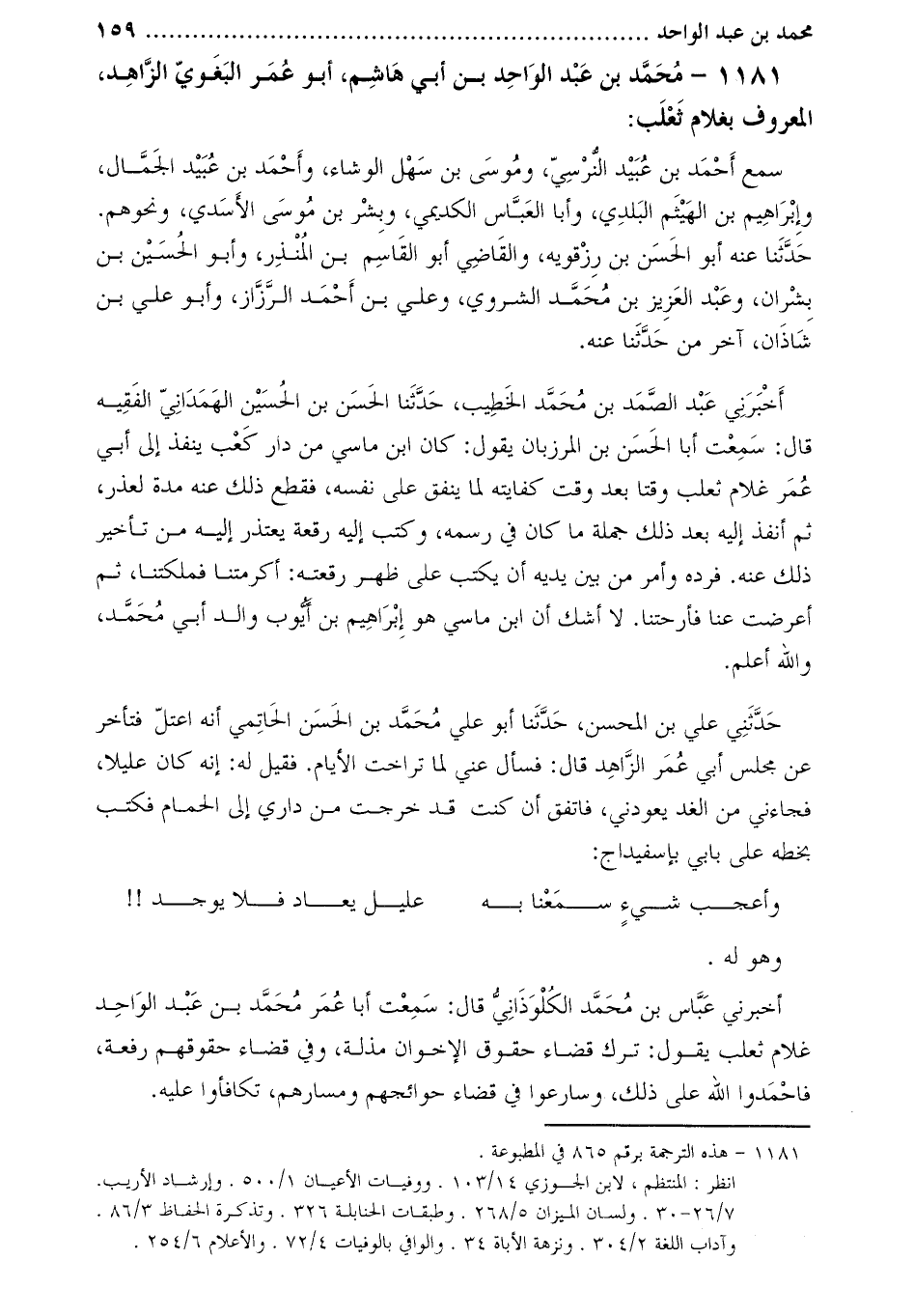 1181- محمد بن عبد الواحد بن أبي هاشم، أبو عمر البغويّ الزاهد، المعروف بغلام ثعلب [1] :