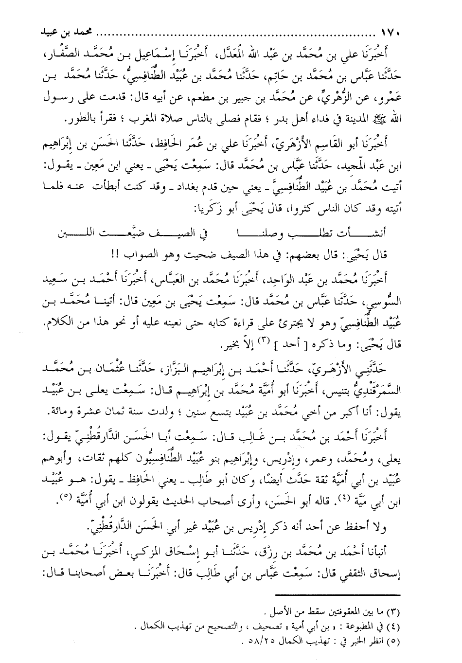 قَالَ يحيى: قَالَ بعضهم: في هذا الصيف ضحيت وهو الصواب!! أَخْبَرَنَا مُحَمَّد بْن عَبْد الواحد، أخبرنا محمد بن العبّاس، أخبرنا أحمد بن سعيد السّوسي، حَدَّثَنَا عباس بن محمد قَالَ: سمعت يحيى بن معين قَالَ: أتينا محمد بن عبيد الطنافسي وهو لا يجترئ على قراءة كتابه حتى نعينه عليه أو نحو هذا من الكلام.