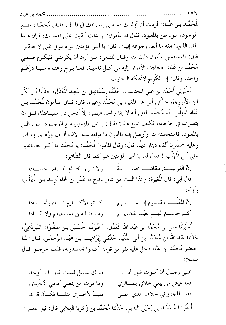 أَخْبَرَنِي أحمد بن علي المحتسب، حدّثنا إسماعيل بن سعيد المعدّل، حدّثنا أبو بكر ابن الأنباريّ، حَدَّثَنِي أبي عن المغيرة بن محمد وغيره. قَالَ: قَالَ المأمون لمحمد بن عباد المهلبي: أبا محمد بلغني أنه لا يقدم أحد البصرة إلا أدخل دار ضيافتك قبل أن يتصرف في حاجاته، فكيف تسع هذا؟ فقال: يا أمير المؤمنين منع الموجود سوء ظن بالمعبود. فاستحسنه منه وأوصل إليه المأمون ما مبلغه ستة آلاف ألف درهم. ومات وعليه خمسون ألف دينار دينا، قَالَ: وَقَالَ المأمون لمحمد: يا محمد ما أكثر الطاعنين على أبي المهلب! فقال له: يا أمير المؤمنين هم كما قال الشّاعر: