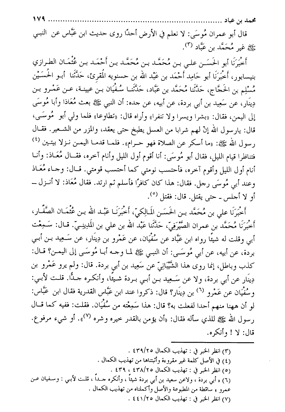 أَخْبَرَنَا عَلِيُّ بْنُ مُحَمَّد بن الحسن المالكي، أخبرنا عبد اللَّه بْن عُثْمَان الصفار، أَخْبَرَنَا مُحَمَّدُ بْنُ عمران الصّيرفيّ، حَدَّثَنَا عَبْدُ اللَّهِ بْنُ عَلِيِّ بْنِ الْمَدِينِيِّ. قَالَ: سَمِعْتُ أَبِي وَقُلْتُ لَهُ شَيْئًا رَوَاهُ ابْنُ عَبَّادٍ عَنْ سُفْيَانَ، عَنْ عَمْرِو بْنِ دِينَارٍ، عَنْ سَعِيدِ بْنِ أَبِي بُرْدَةَ، عَنْ أَبِيهِ، عَنْ أَبِي مُوسَى: أَنَّ النَّبِيَّ صَلَّى اللَّهُ عَلَيْهِ وَسَلَّمَ لَمَّا وَجَّهَ أَبَا مُوسَى إِلَى الْيَمَنِ؟ قَالَ: