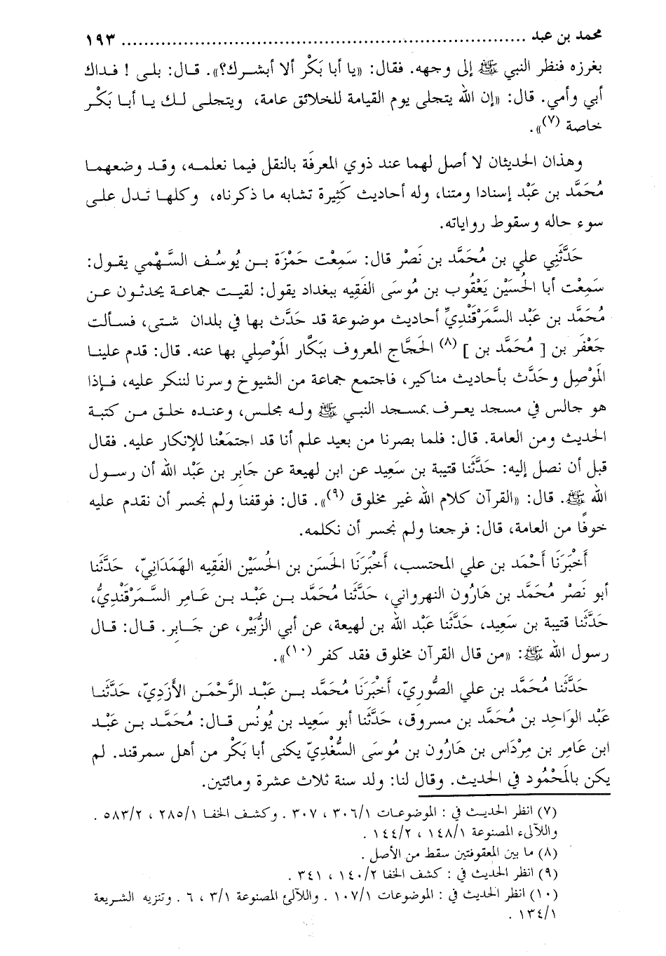 سَمِعْتُ أَبَا الْحُسَيْنِ يَعْقُوبَ بْنَ مُوسَى الْفَقِيهَ بِبَغْدَادَ يَقُولُ: لَقِيتُ جَمَاعَةً يُحَدِّثُونَ عَنْ مُحَمَّدِ بْنِ عَبْدٍ السَّمَرْقَنْدِيُّ أَحَادِيثَ مَوْضُوعَةً قَدْ حَدَّثَ بِهَا فِي بُلْدَانٍ شَتَّى، فَسَأَلْتُ جَعْفَرَ بْنَ [محمّد بن] [2] الحجّاج المعروف ببكّار الموصلي بها عنه. قال: قَدِمَ عَلَيْنَا الْمَوْصِلَ وَحَدَّثَ بِأَحَادِيثَ مَنَاكِيرَ، فَاجْتَمَعَ جماعة من الشيوخ وسرنا لِنُنْكِرَ عَلَيْهِ، فَإِذَا هُوَ جَالِسٌ فِي مَسْجِدٍ يُعْرَفُ بِمَسْجِدِ النَّبِيِّ صَلَّى اللَّهُ عَلَيْهِ وَسَلَّمَ وَلَهُ مَجْلِسٌ، وَعِنْدَهُ خَلْقٌ مِنْ كَتَبَةِ الْحَدِيثِ ومن العامة. قال: فلما بصرنا مِنْ بَعِيدٍ عَلِمَ أَنَّا قَدِ اجْتَمَعْنَا لِلإِنْكَارِ عَلَيْهِ. فَقَالَ قَبْلَ أَنْ نَصِلَ إِلَيْهِ: حَدَّثَنَا قُتَيْبَةُ بْنُ سَعِيدٍ عَنِ ابْنِ لَهِيعَةَ عَنْ جَابِرِ بْنِ عَبْدِ اللَّهِ أَنَّ رَسُولَ اللَّهِ صَلَّى اللَّهُ عَلَيْهِ وَسَلَّمَ. قَالَ: «الْقُرْآنُ كَلامُ اللَّهِ غَيْرُ مَخْلُوقٍ [3] »