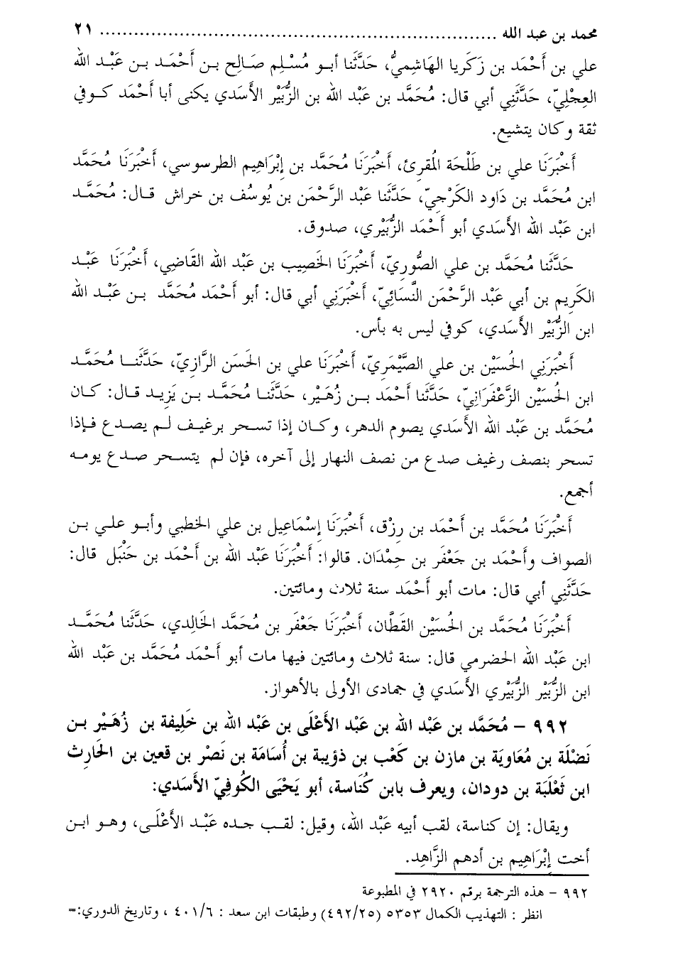 أَخْبَرَنَا علي بن طلحة المقرئ، أخبرنا محمّد بن إبراهيم الطرسوسي، أخبرنا محمّد ابن محمّد بن داود الكرجيّ، حَدَّثَنَا عبد الرحمن بن يوسف بن خراش قال: محمّد ابن عبد الله الأسدي أبو أحمد الزبيري، صدوق.