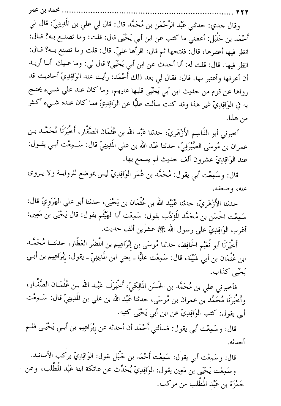 قَالَ: وسَمِعْتُ أَبِي يَقُولُ: سَمِعْتُ أَحْمَدَ بْنَ حَنْبَلٍ يَقُولُ: الواقدي يركب الأسانيد.