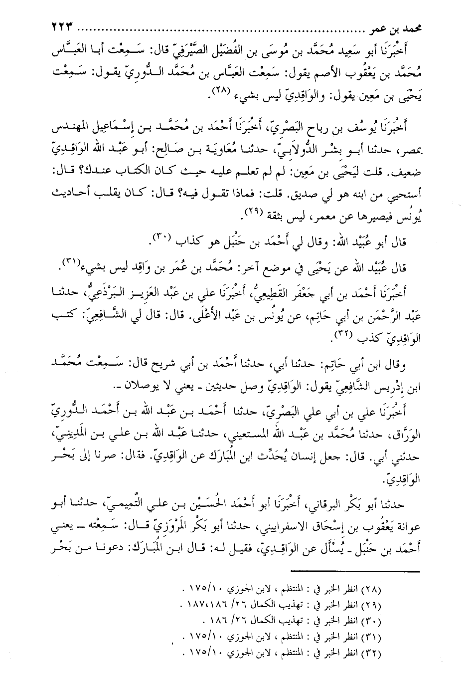 أخبرنا أَحْمَدُ بْنُ أَبِي جَعْفَر القطيعيّ، أخبرنا علي بن عبد العزيز البرذعيّ، حَدَّثَنَا عبد الرحمن بن أبي حاتم، عن يونس بن عبد الأعلى. قَالَ: قَالَ لي الشافعي: كتب الواقدي كذب [5] .