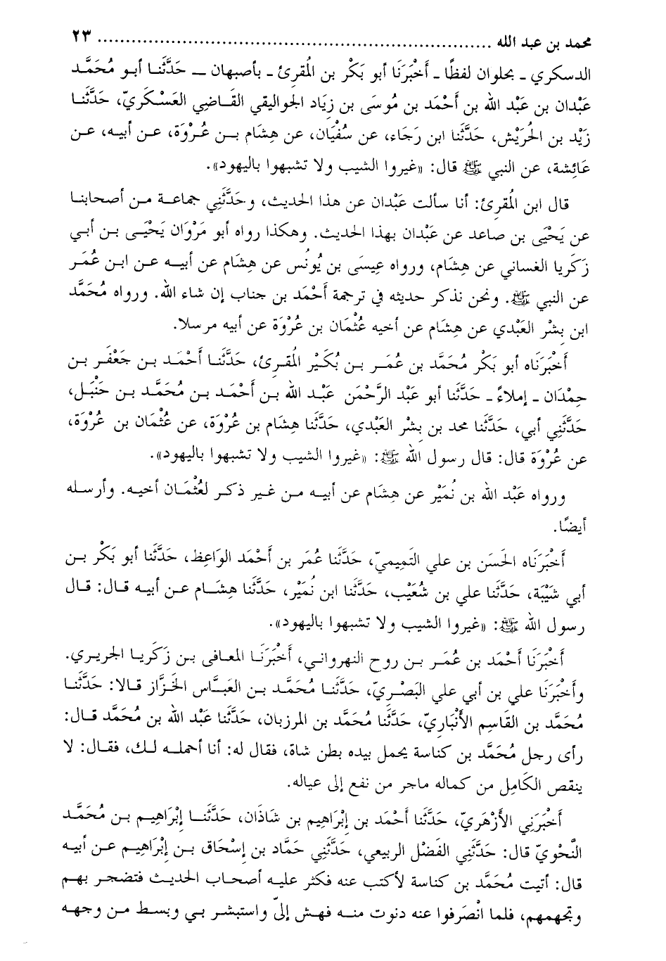 الدسكري- بحلوان لفظا- أخبرنا أبو بكر بن المقرئ- بأصبهان- حدّثنا أبو محمّد عبدان بن عَبْدُ اللَّهِ بْنُ أَحْمَدَ بْنِ مُوسَى بْنِ زياد الجواليقي القاضي العسكريّ، حدّثنا زيد بن الحريش، حَدَّثَنَا ابْنُ رَجَاءٍ، عَنْ سُفْيَانَ، عَنْ هِشَامِ بْنِ عُرْوَةَ، عَنْ أَبِيهِ، عَنْ عَائِشَةَ، عَنِ النَّبِيِّ صَلَّى اللَّهُ عَلَيْهِ وَسَلَّمَ قَالَ: «غَيِّرُوا الشَّيْبَ وَلا تَشَبَّهُوا بِالْيَهُودِ»
