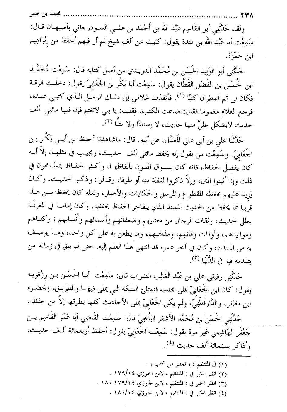 حَدَّثَنِي أبو الوليد الْحَسَن بن مُحَمَّد الدربندي من أصل كتابه قَالَ: سمعت محمد ابن الحسين بن الفضل القطان يقول: سمعت أبا بكر بن الجعابي يقول: دخلت الرقة فكان لي ثم قمطران كتبا [1] . فأنفذت غلامي إلى ذلك الرجل الذي كتبي عنده، فرجع الغلام مغموما فقال: ضاعت الكتب. فقلت: يا بني لا تغتم فإن فيها مائتي ألف حديث لا يشكل على منها حديث، لا إسنادا ولا متنا [2] .