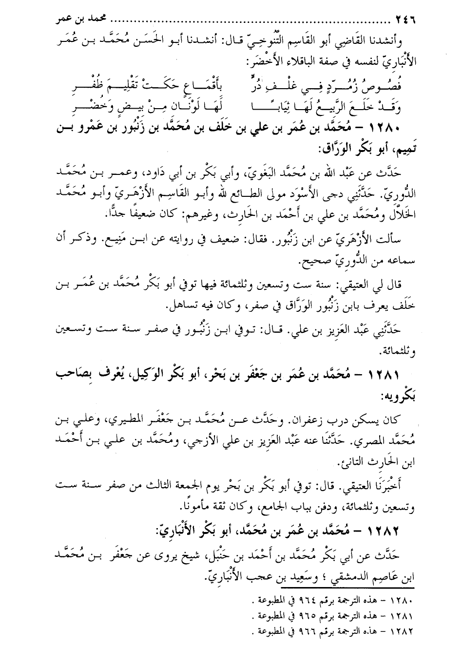 1280- مُحَمَّدُ بْنُ عُمَرَ بْنِ عَلِيِّ بْنِ خَلَفِ بن محمد بن زنبور بن عمرو بن تميم، أبو بكر الوراق [1] :