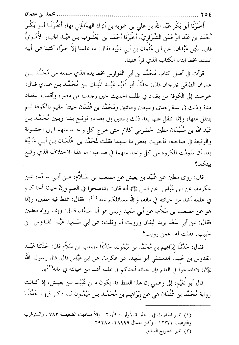 حَدَّثَنَا إِبْرَاهِيمُ بْنُ مُحَمَّدِ بْنِ ميمون، حَدَّثَنَا مُصْعَبُ بْنُ سَلامٍ قَالَ: حَدَّثَنَا عَبْدُ الْقُدُّوسِ بْنُ حَبِيبٍ الدِّمَشْقِيُّ أَبُو سَعِيدٍ، عَنْ عِكْرِمَةَ، عَنِ ابْنِ عَبَّاسٍ قَالَ: قَالَ رَسُولُ اللَّهِ صَلَّى اللَّهُ عَلَيْهِ وَسَلَّمَ: «تَنَاصَحُوا فِي الْعِلْمِ فَإِنَّ خِيَانَةَ أَحَدِكُمْ فِي عِلْمِهِ أَشَدُّ مِنْ خِيَانَتِهِ فِي مَالِهِ [2] »