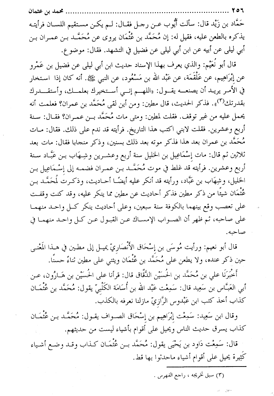حماد بن زيد قَالَ: سألت أيوب عن رجل فقال: لم يكن مستقيم اللسان فرأيته يذكره بالطعن عليه، فقيل له: إن محمد بن عثمان يروى عَنْ مُحَمَّد بْن عمران بْن أَبِي ليلى عن أبيه عن ابن أبي ليلى عن فضيل في التشهد. فقال: موضوع.